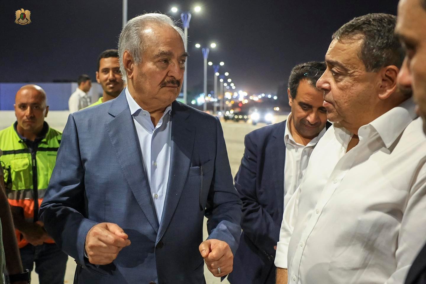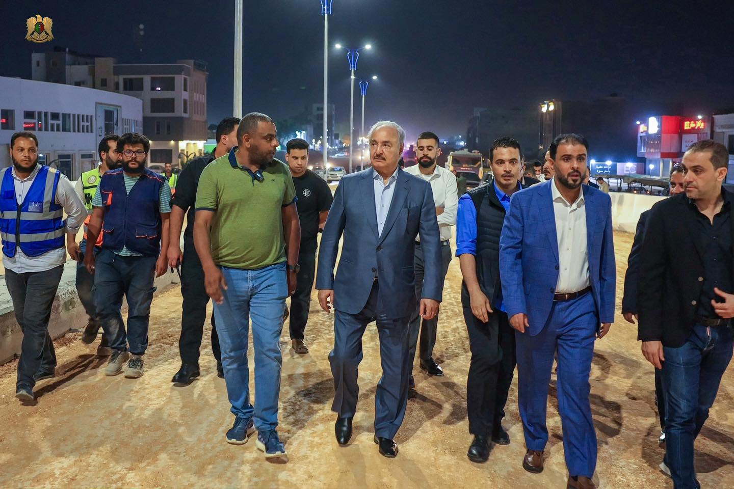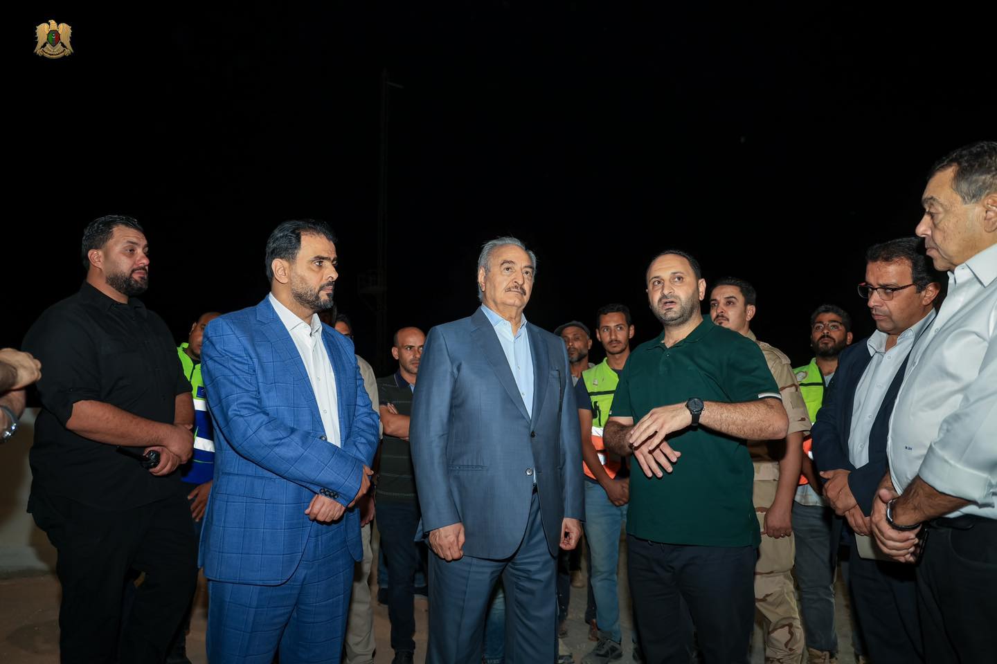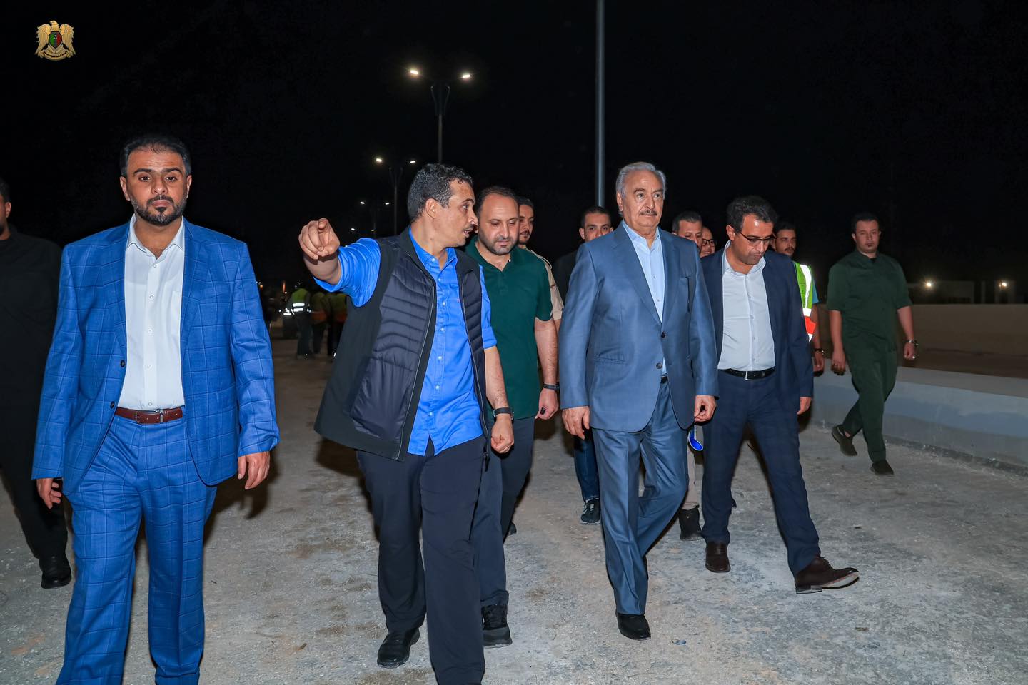 ورافق المشير حفتر في جولته رئيس الحكومة الليبية “أسامة حماد” ورئيس لجنة إعادة الإعمار والاستقرار حاتم العريبي، وذلك للاطلاع على أعمال الإنشاء والتجهيزات في مراحلها الأخيرة.