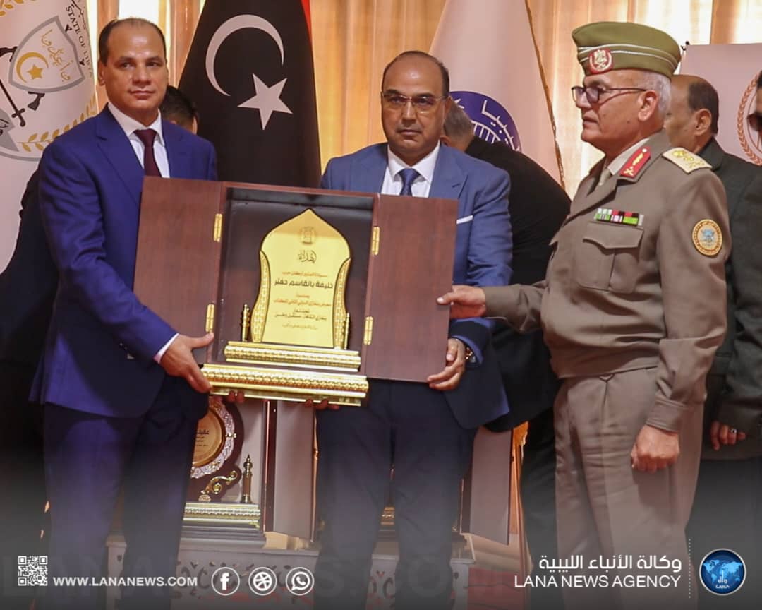 وتضمن الحفل، عروضاً ولوحات فنية لفرق الفنون الشعبية والأطفال، واختتم بتوزيع دروع من وزارة الدفاع، للقائد العام المشير «خليفة حفتر» ولرئيس الحكومة «أسامة حماد». (الأنباء الليبية)