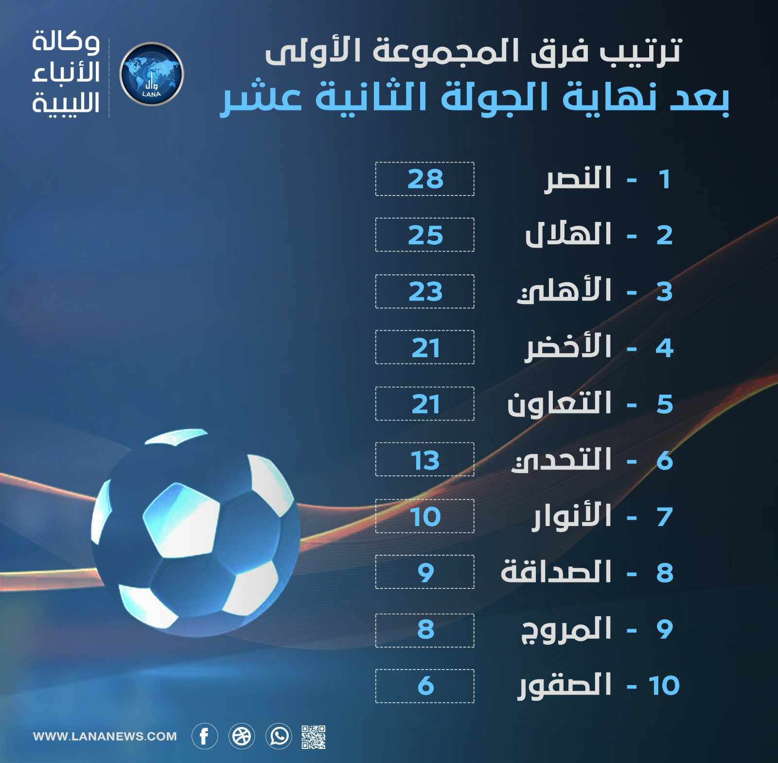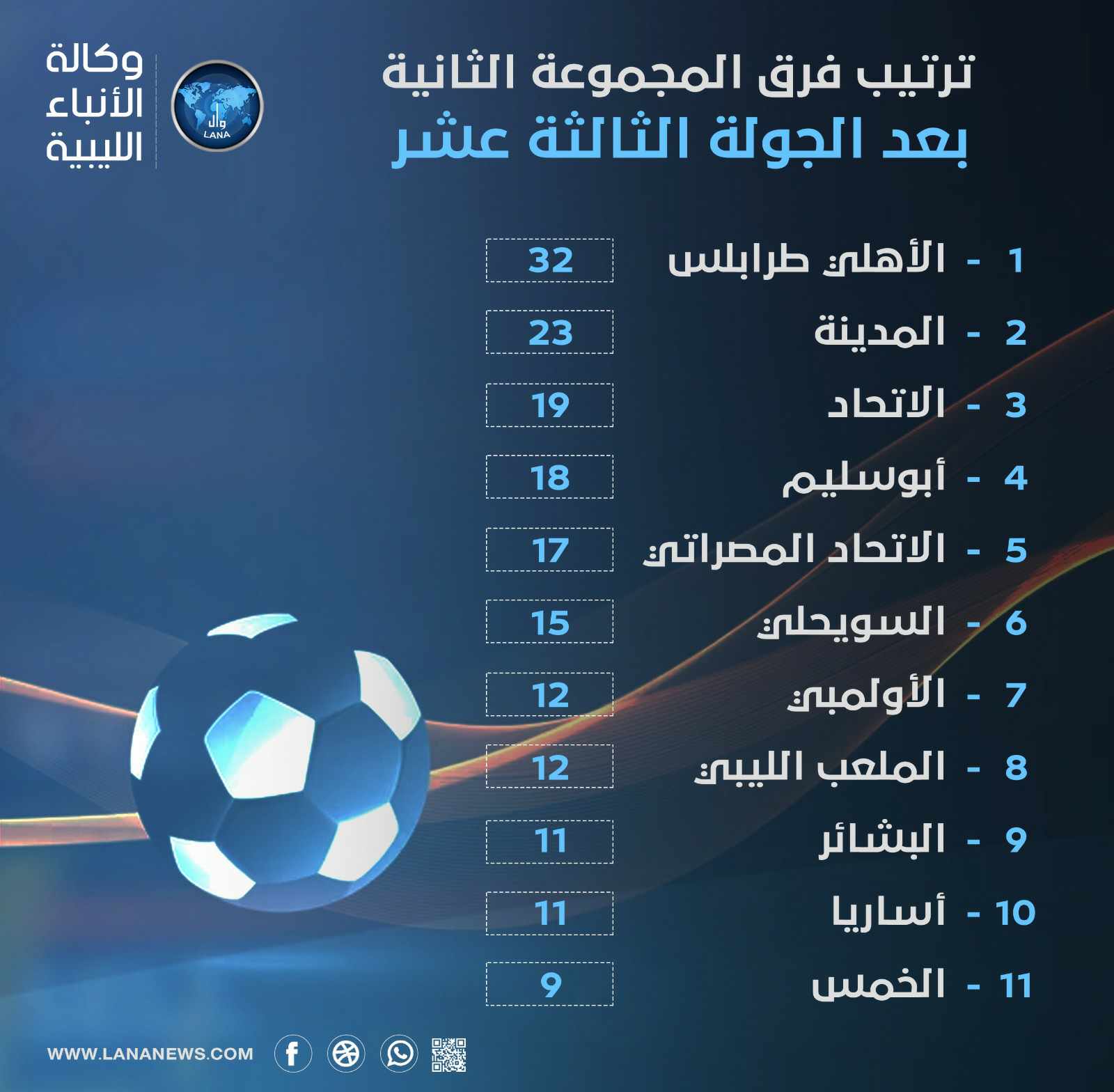 ويعتلي فريق الأهلي طرابلس صدارة المجموعة الثانية، برصيد (32) نقطة، ومحققا الفوز في عشر لقاءات، بينما فقد نتيجة لقاء وحيد، في حين يأتي فريق الخمس أخر ترتيب المجموعة برصيد ( 9 ) نقاط.( بنغازي – الأنباء الليبية) ف ح / س أ