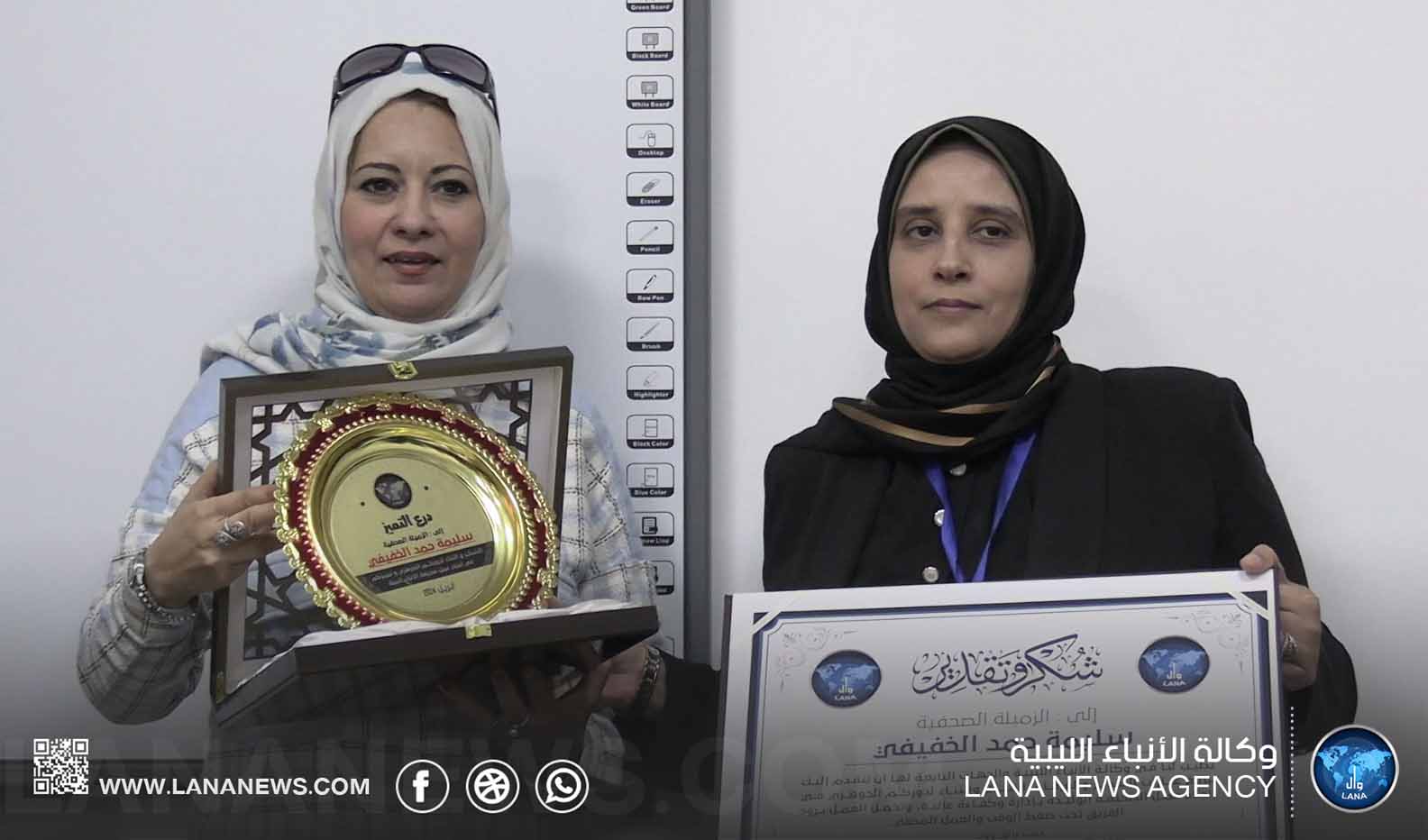 واختتمت مراسم التكريم بتقديم المدير العام شهادة تقدير ودرع التميز، للصحفية سليمة الخفيفي، تقديراً وعرفاناً من الوكالة لجهودها ومثابرتها وتفانيها في العمل الصحفي. (الأنباء الليبية)