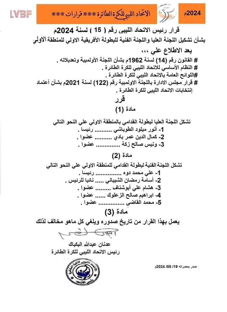 وأوضح أنه قبيل انطلاق البطولة أصدر الاتحاد الليبي للعبة قراري رقم 15 – 14، بشأن تشكيل لجان العليا والفنية والمشرفة على البطولة.