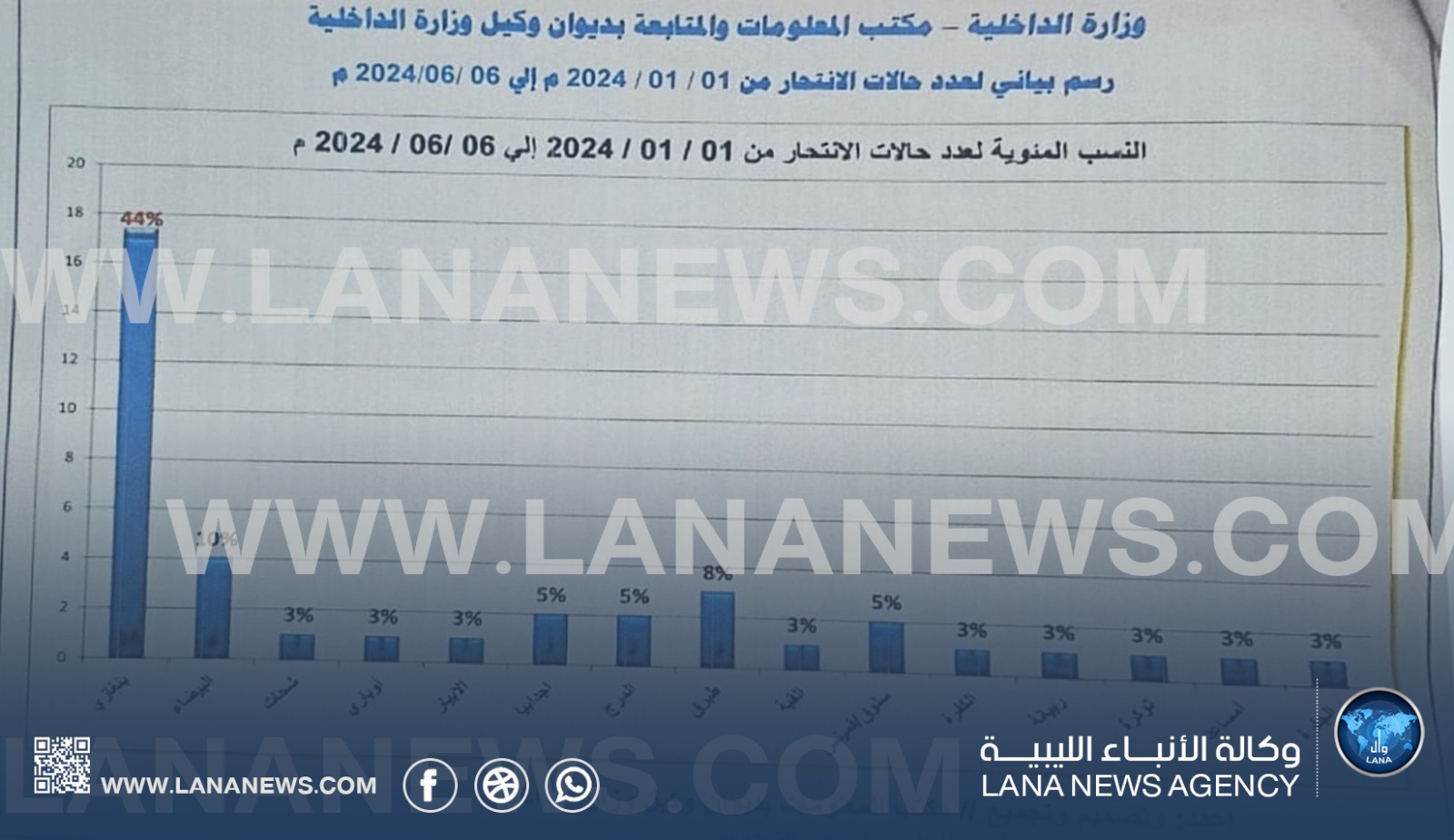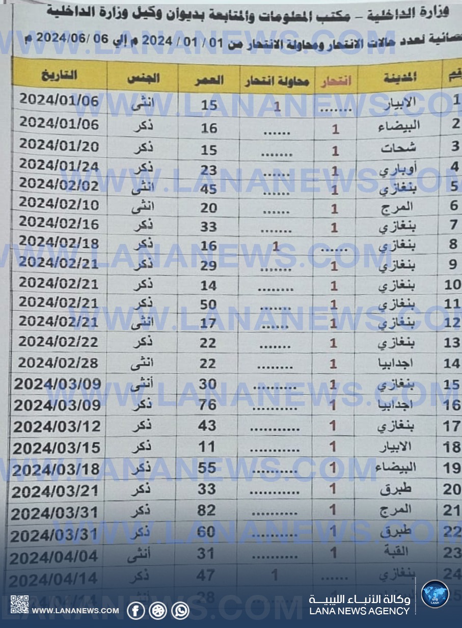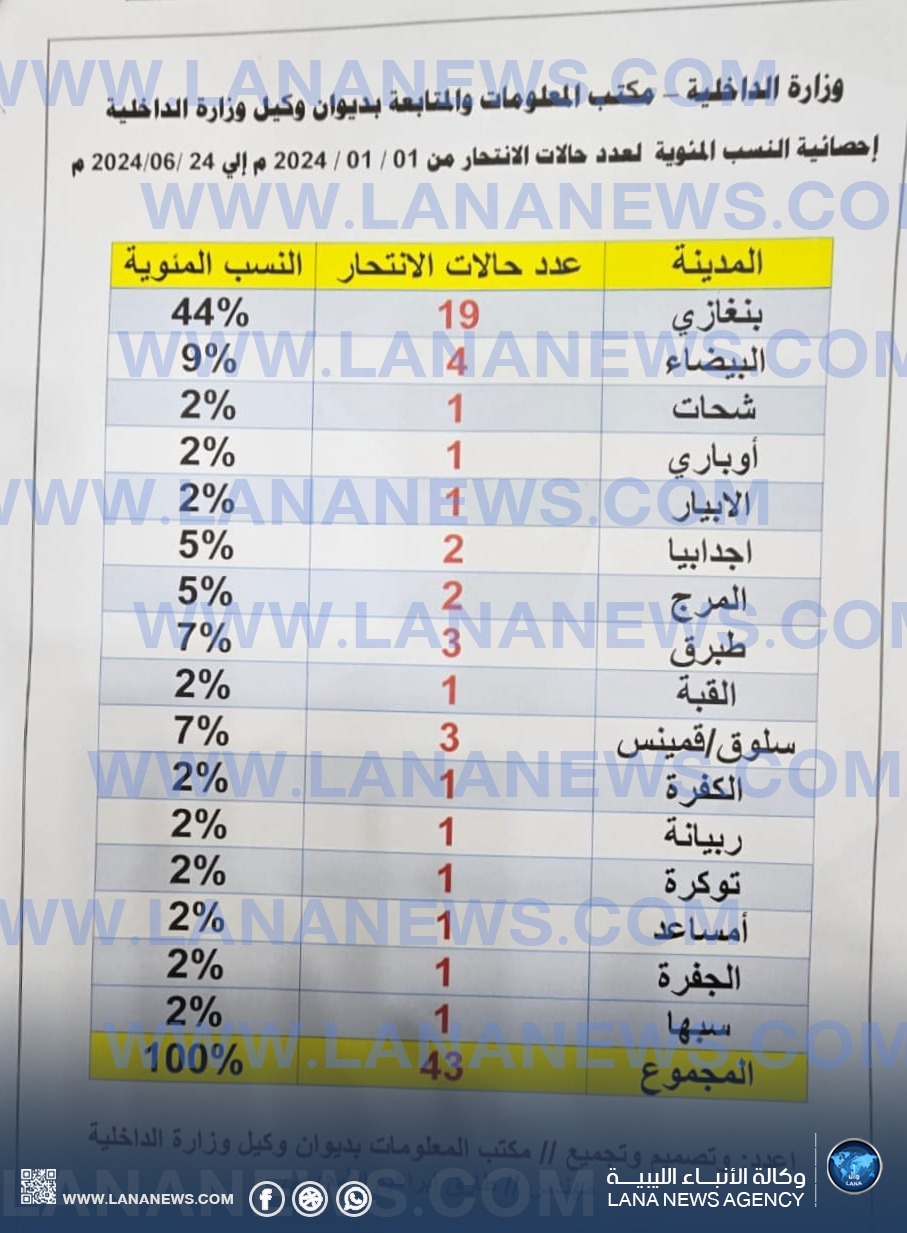 بحسب إحصائيات النسب المئوية لعدد حالات الانتحار المسجلة لدى مكتب المعلومات التابع لديوان وكيل وزارة الداخلية بالحكومة الليبية، والتي أعدها المهندس طارق الشحومي، منذ الأول من شهر يناير وحتى 24 يونيو 2024، كانت نسبة الحالات على النحو التالي: بنغازي (44%)، البيضاء (9%)، شحات، أوباري، الأبيار، القبة، الكفرة، ربيانة، توكرة، أمساعد، الجفرة، سبها (2%)، سلوق، قمينس، طبرق (7%)، أجدابيا، المرج (5%). سجلت تلك المناطق 43 حالة انتحار خلال النصف الأول من العام الحالي 2024، بالإضافة إلى 6 حالات تم إنقاذها، ليصبح إجمالي الذين اتخذوا قرار إنهاء حياتهم 49 حالة من بينهم ثلاثة عرب ، وكان النصيب الأكبر للذكور.