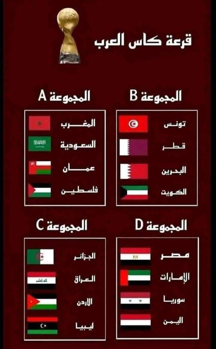 وضمت المجموعة الأولى منتخبات تونس، قطر ، البحرين ، الكويت ، والمجموعة الثانية المغرب، السعودية ، عمان، فلسطين، والمجموعة الثالثة مصر، الإمارات، سوريا، واليمن.(الأنباء الليبية ـ سويسرا) ك و
