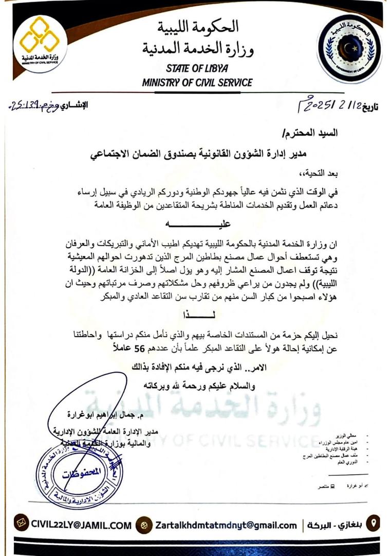 بنغازي 12 فبراير 2025 ( الأنباء الليبية) ـ خاطبت وزارة الخدمة المدنية بالحكومة الليبية صندوق الضمان الاجتماعي بشأن إحالة موظفي مصنع “بطاطين المرج” للتقاعد المبكر، وذلك في إطار معالجة أزمة تعثر أوضاع العاملين بالمصنع.