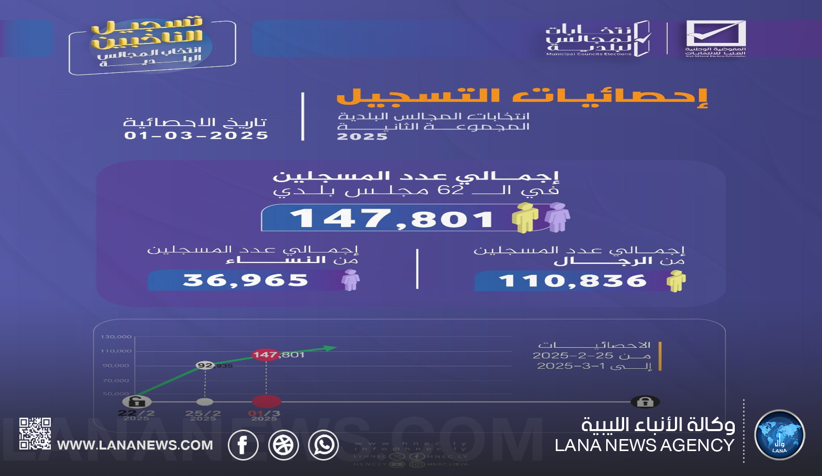 وأوضحت المفوضية أن عدد الناخبين المسجلين حتى الأول من مارس بلغ 147.801 ناخبًا وناخبة في 62 مجلسًا بلديًا.