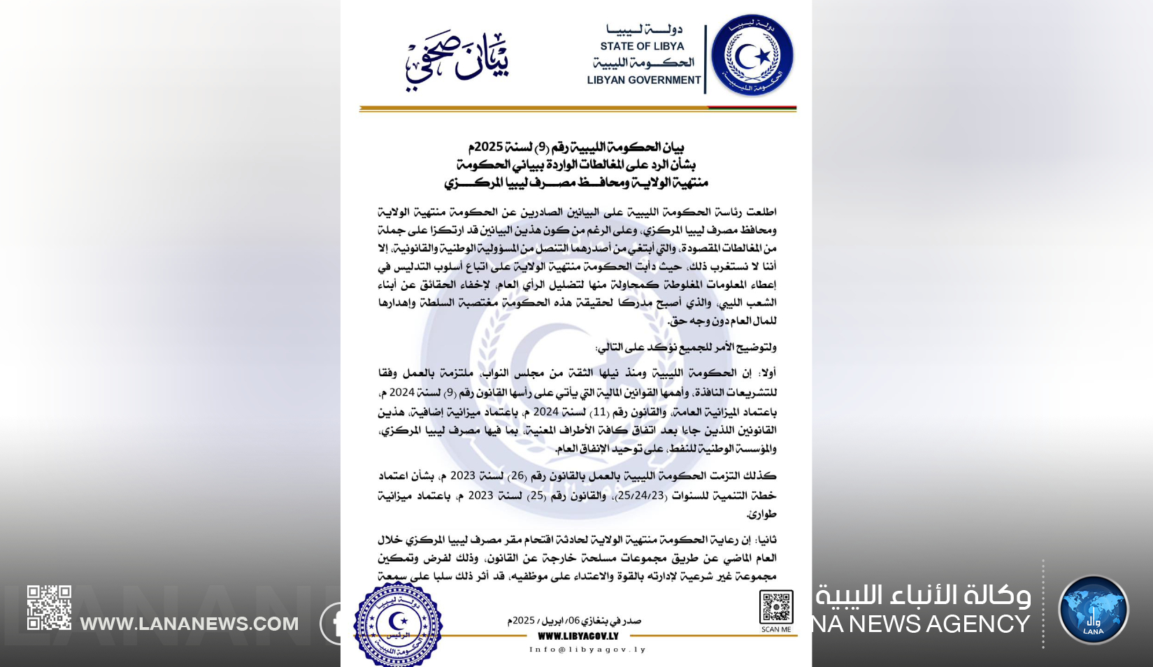 بنغازي 06 أبريل 2025 (الأنباء الليبية) – أكدت الحكومة الليبية، أنها اطلعت على البيانات الصادرة عن الحكومة منتهية الولاية ومحافظ مصرف ليبيا المركزي، واعتبرت أن هذه البيانات تضمنّت مغالطات تهدف إلى التنصل من المسؤولية الوطنية والقانونية.
