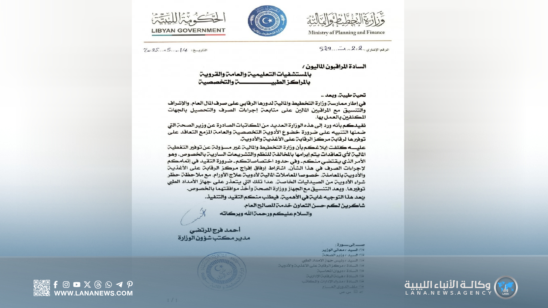 وأشار إلى أن هذا التوجيه يأتي في إطار تعزيز الرقابة على المال العام، وضمان التزام الجهات المعنية بالإجراءات القانونية في صرف الأدوية وتوفيرها. (الأنباء الليبية – بنغازي) ر ت