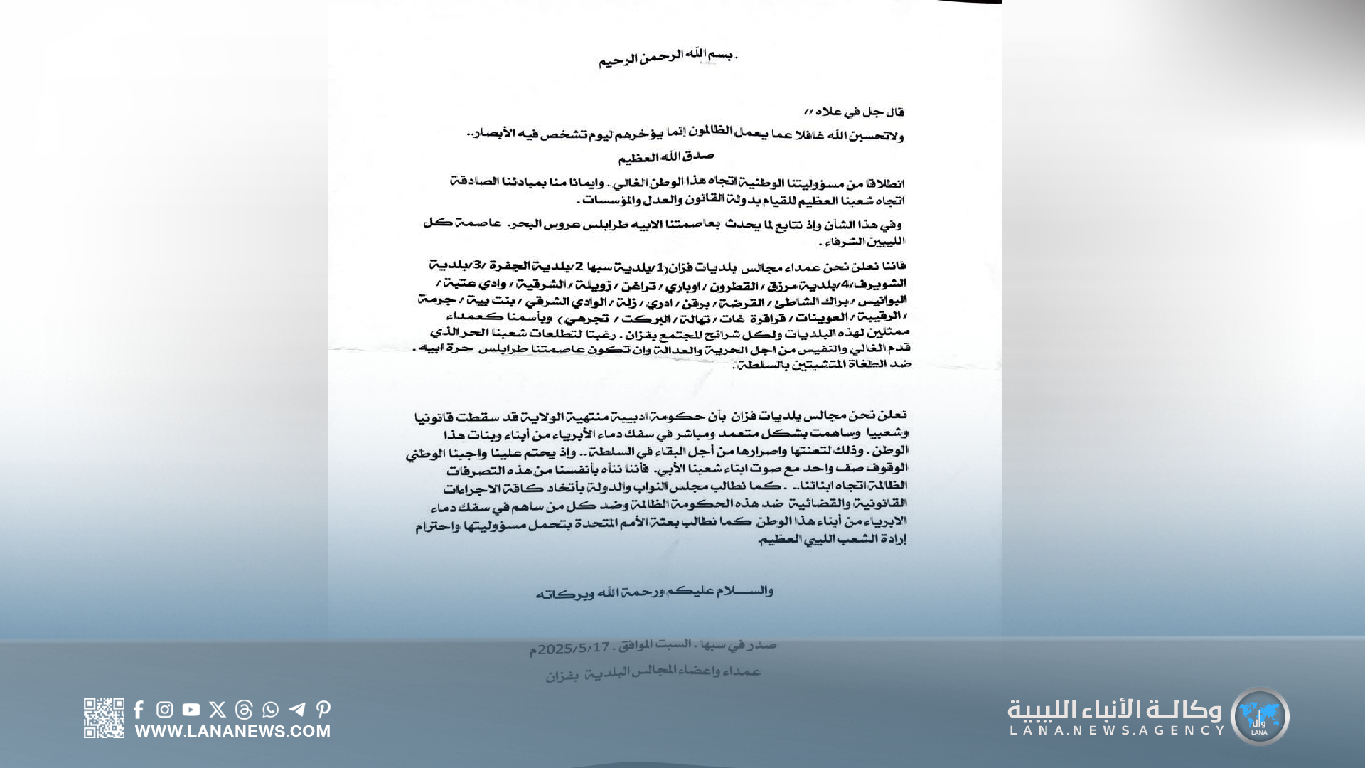 البيان صدر من مدينة سبها، جاء فيه: “انطلاقًا من مسؤوليتنا الوطنية وإيمانًا منا بمبادئنا الصادقة تجاه شعبنا العظيم، فإننا كعمداء وممثلي بلديات فزان، نُعلن وقُوفنا إلى جانب إرادة الشعب الليبي في رفض الظلم والاستبداد، ونُؤكد أن حكومة الدبيبة قد سقطت قانونيًا وشعبيًا نتيجة تعنتها وتمسكها غير المشروع بالسلطة”.