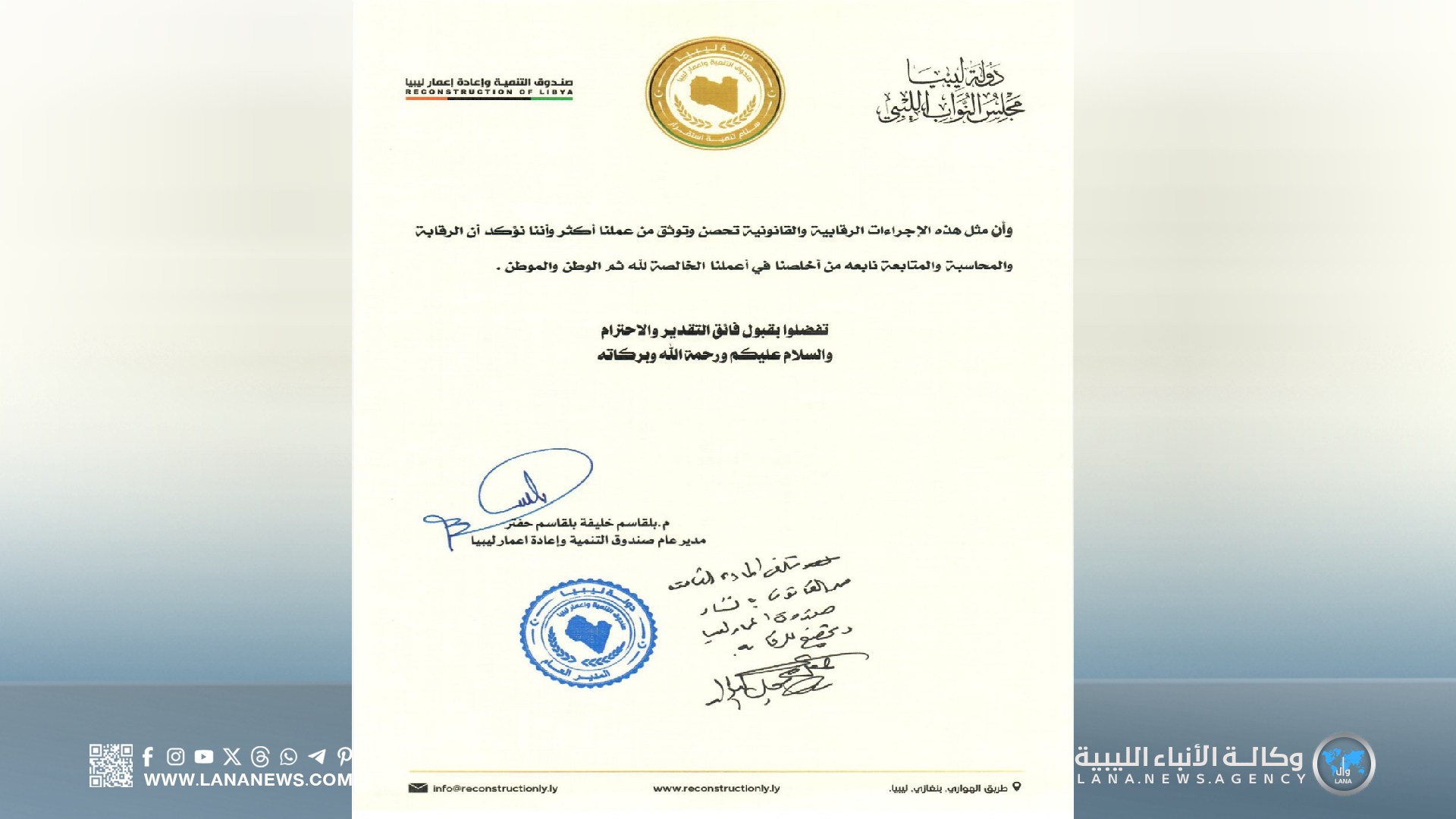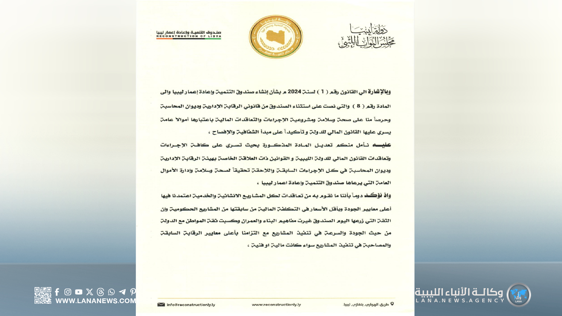 وأكد مدير عام الصندوق، في مراسلته الرسمية، لرئيس مجلس النواب، على أهمية هذا القرار كخطوة حاسمة لضمان مشروعية وصحة الإجراءات والتعاقدات المالية للصندوق، مُشيرًا إلى أن الأموال التي يُديرها الصندوق تُعتبر أموالًا عامة تسري عليها قوانين الدولة الليبية، وبالأخص قانوني هيئة الرقابة الإدارية وديوان المحاسبة.
