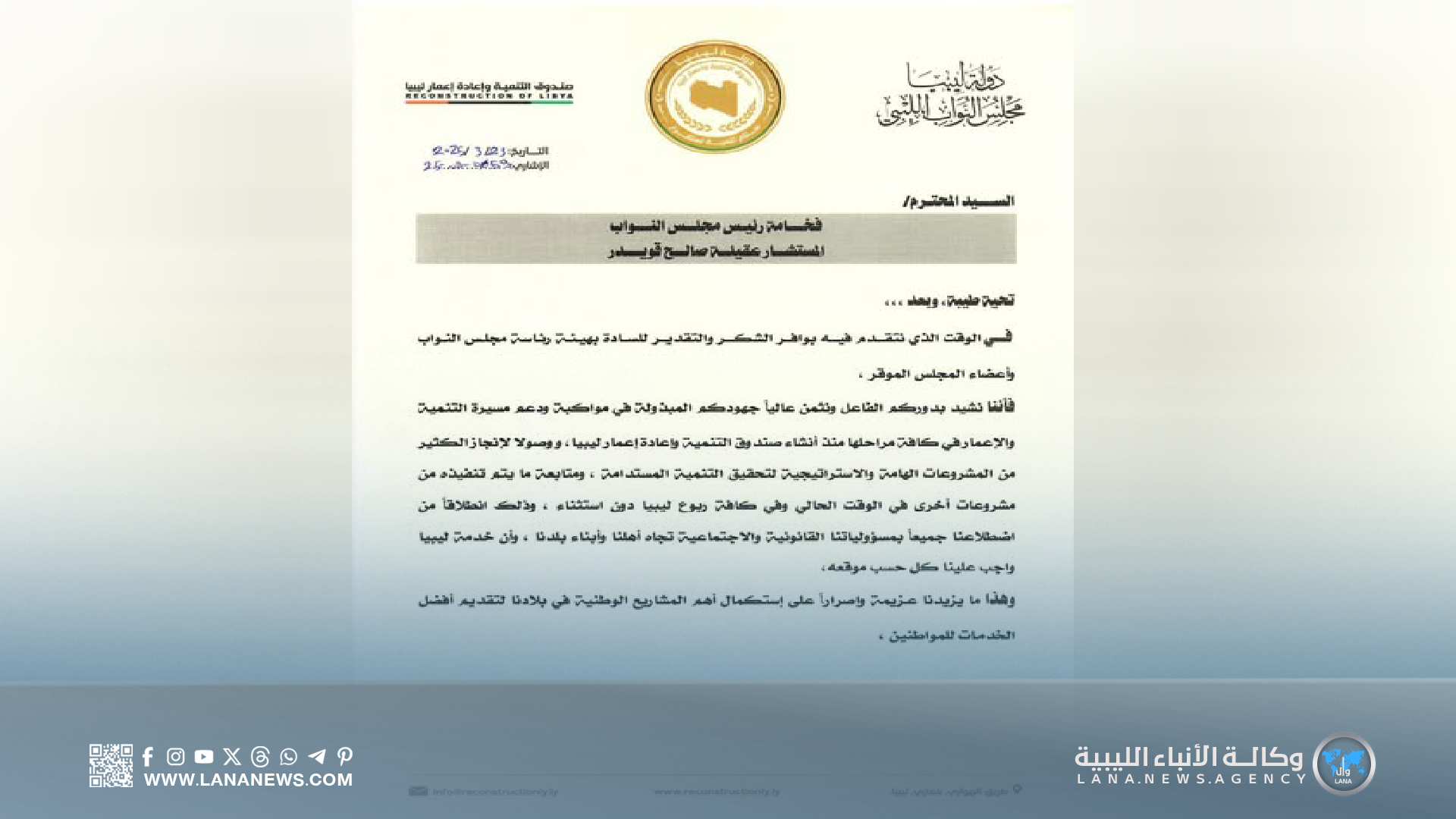 بنغازي 02 يونيو 2025 (الأنباء الليبية) – أعلن رئيس مجلس النواب، المستشار عقيلة صالح، موافقته على طلب مدير عام صندوق التنمية وإعادة إعمار ليبيا، المهندس بالقاسم خليفة، بشأن إلغاء كافة الاستثناءات المتعلقة بخضوع الصندوق للرقابة الإدارية والمالية، وفقًا لأحكام القوانين الليبية ذات الصلة، بما يُعزز مبدأ الشفافية والمساءلة في إدارة الأموال العامة.