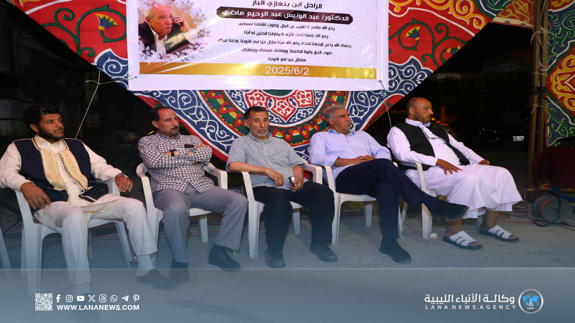 بنغازي 03 يونيو 2025 (الأنباء الليبية) – شارك عدد من الإعلاميين والمثقفين الليبيين، في احتفالية تأبينية أقيمت أمس بمنزل الفقيد الدكتور ونيس عبد الرحيم ماضي، المستشار الإعلامي بمؤسسة الخدمات الإعلامية بمجلس النواب، والذي وافته المنية يوم الأربعاء الموافق 1 يونيو 2022، عن عمر ناهز 65 عامًا، بعد مسيرة مهنية ووطنية حافلة بالعطاء والالتزام.