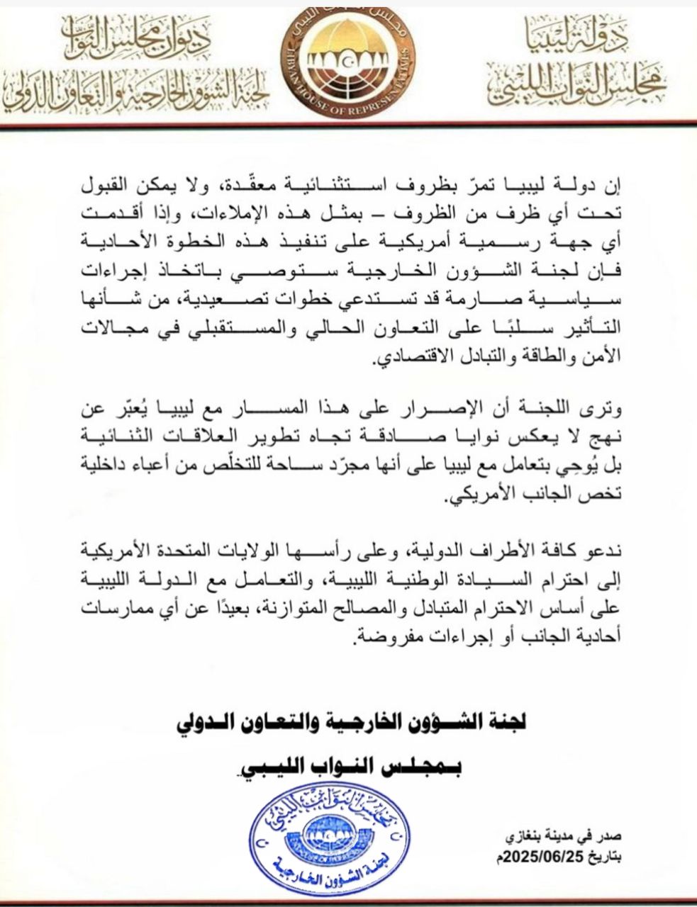 بنغازي 26 يونيو 2025 (الأنباء الليبية) – أصدرت لجنة الخارجية والتعاون الدولي بمجلس النواب بياناً أعربت فيه عن استنكارها الشديد ورفضها القاطع لمحاولات ترحيل متسللين ومجرمين من الولايات المتحدة إلى ليبيا.