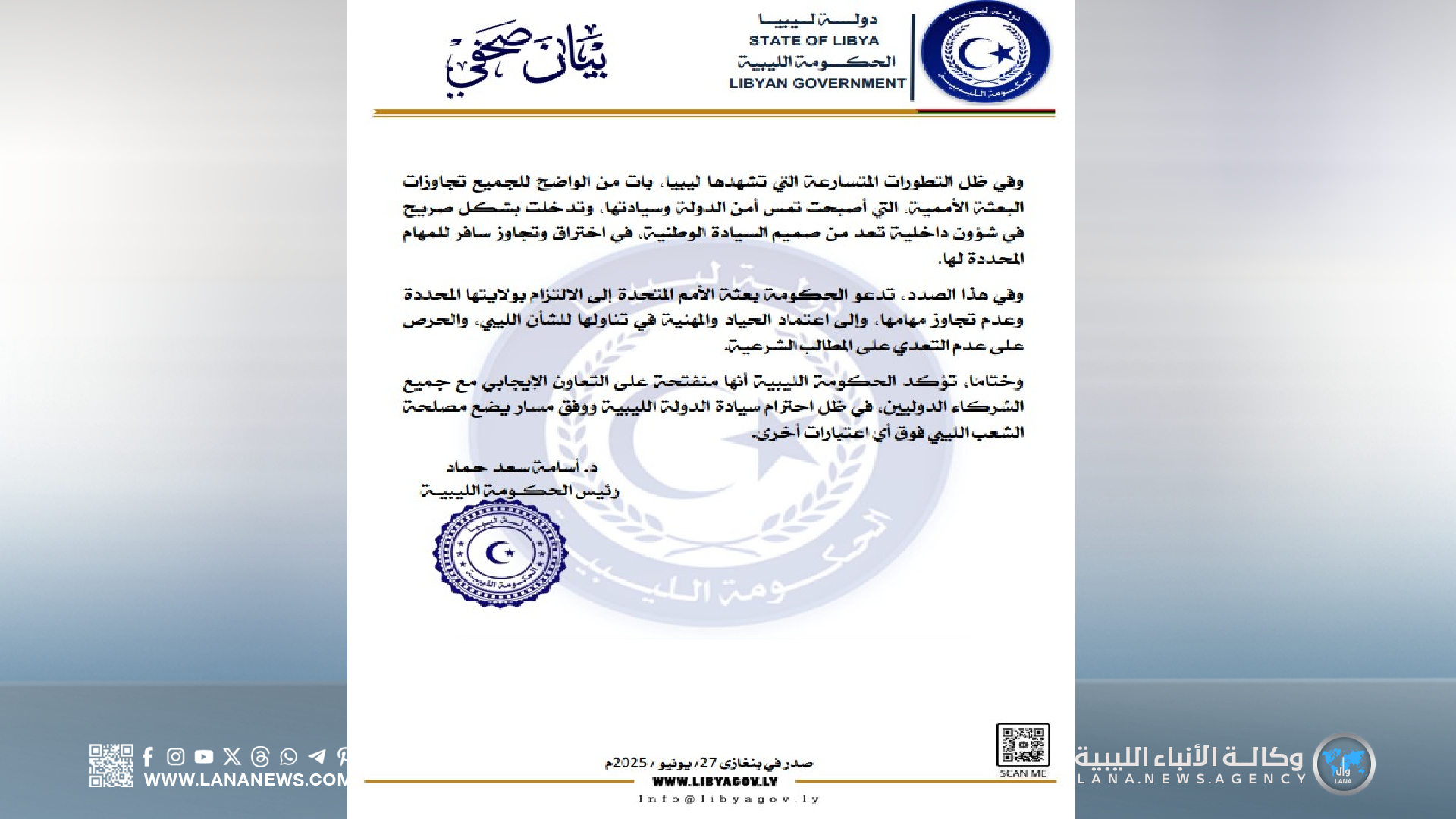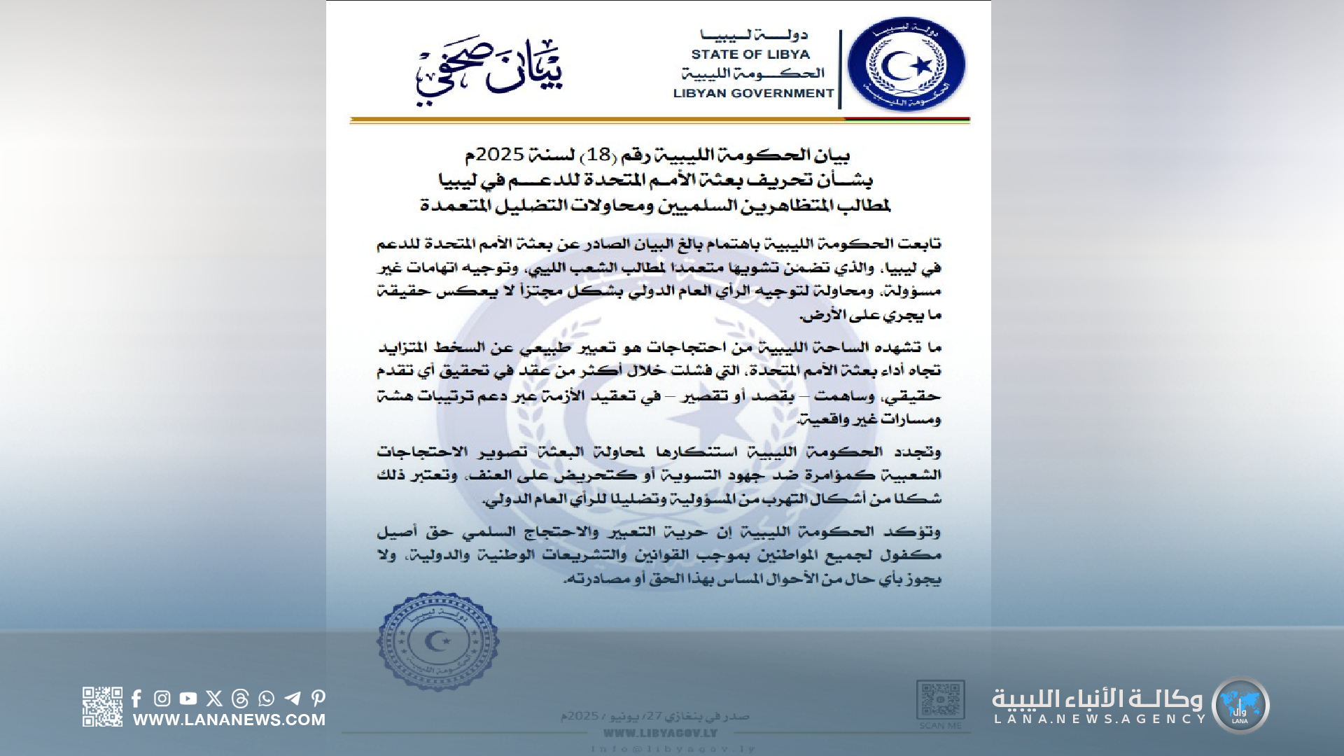 بنغازي 27 يونيو 2025 (الأنباء الليبية) – أصدرت الحكومة الليبية، اليوم الجمعة، بيانًا رسميًا أعربت فيه عن رفضها لما ورد في بيان بعثة الأمم المتحدة للدعم في ليبيا، مُتهمةً إياها بـ”التحريف المتعمّد” لمطالب المتظاهرين السلميين، ومحاولة تضليل الرأي العام الدولي.