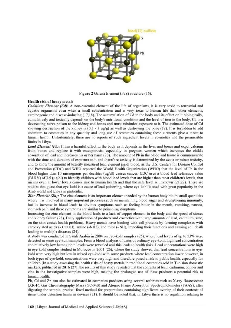 وحملت الدراسة عنوان: «تقدير مستويات المعادن الثقيلة (الرصاص، الكادميوم، والزنك) في عينات الكحل الخام والتجاري والتقليدي المباعة في ليبيا»، وجرت خلالها عملية تحليل لـ 27 عينة مختلفة من منتجات تجميل العيون، شملت أقلام الكحل، مستحضرات التاتو، والكحل التقليدي.