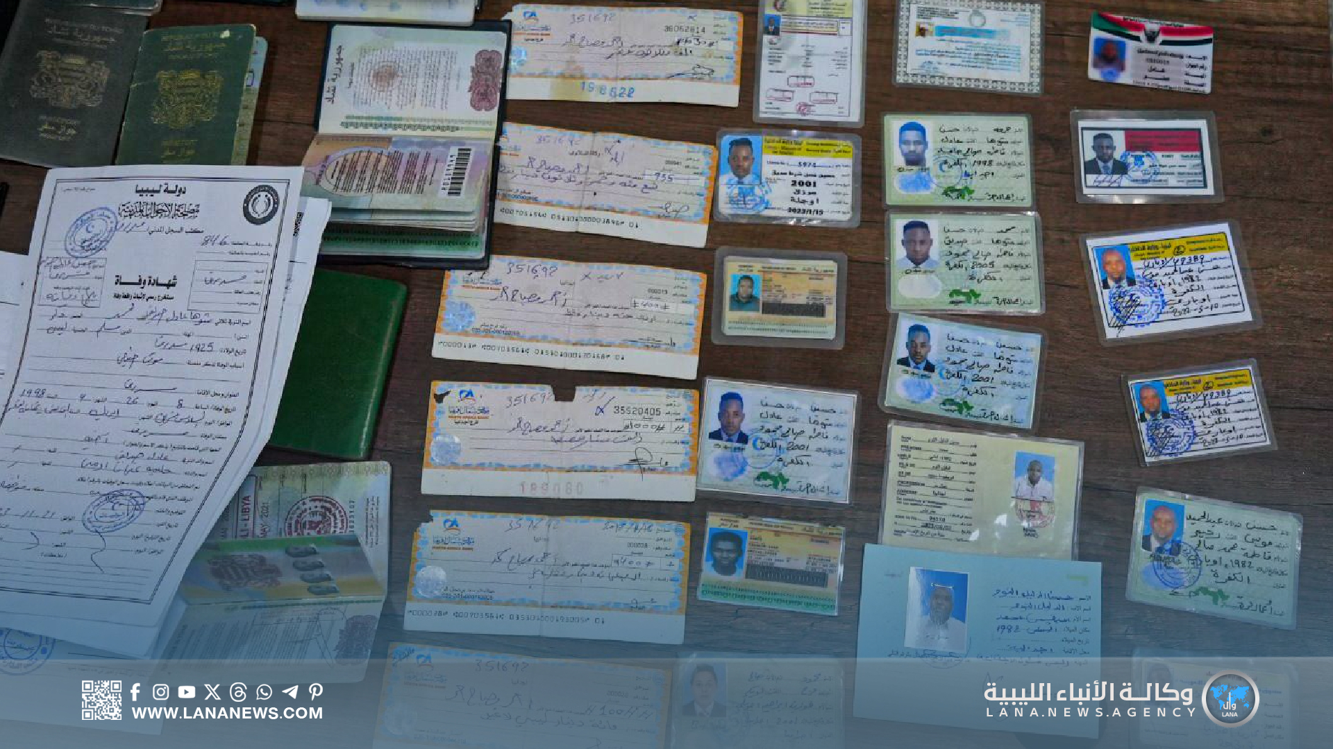 وارتبط التشكيل بأنشطة إجرامية متعددة داخل مدينة أجدابيا، شملت تزوير المستندات والتلاعب بالهوية الليبية، حيث ضبطت شهادات ميلاد وأرقام وطنية وأوضاع عائلية تخص مواطنين ليبيين حقيقيين جرى الحصول عليها دون علمهم، مقابل مبالغ مالية، كما ضبطت بطاقات شخصية ورخص قيادة تحمل صور المقبوض عليهم بأسماء مستعارة لمواطنين ليبيين.