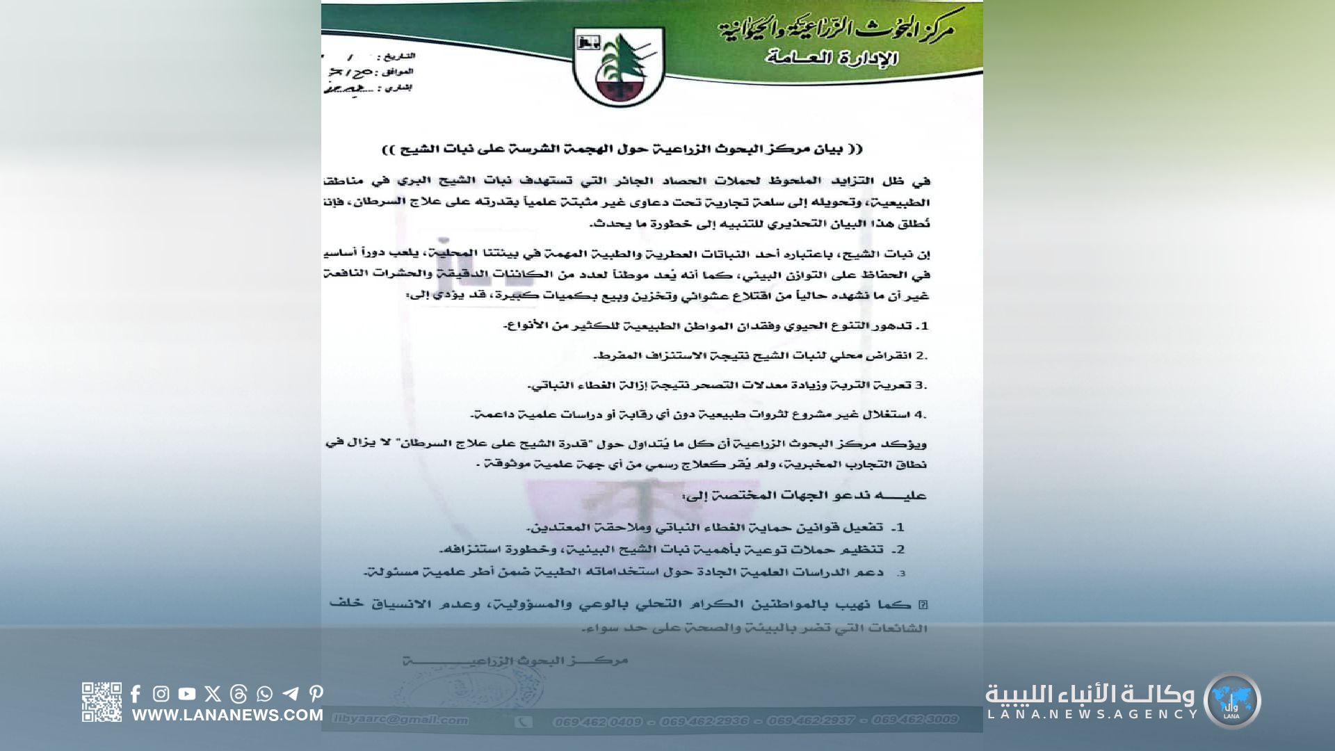 وأضافت أن الاستنزاف الحالي لهذا النبات يُنذر بـتدهور التنوع البيولوجي، وانقراض محلي محتمل، وتعرية التربة، وزيادة معدلات التصحر، مشددة على أن المعلومات المتداولة حول فاعلية الشيح في علاج السرطان لا تزال ضمن نطاق التجارب المخبرية ولم تعتمدها أي جهة علمية موثوقة.