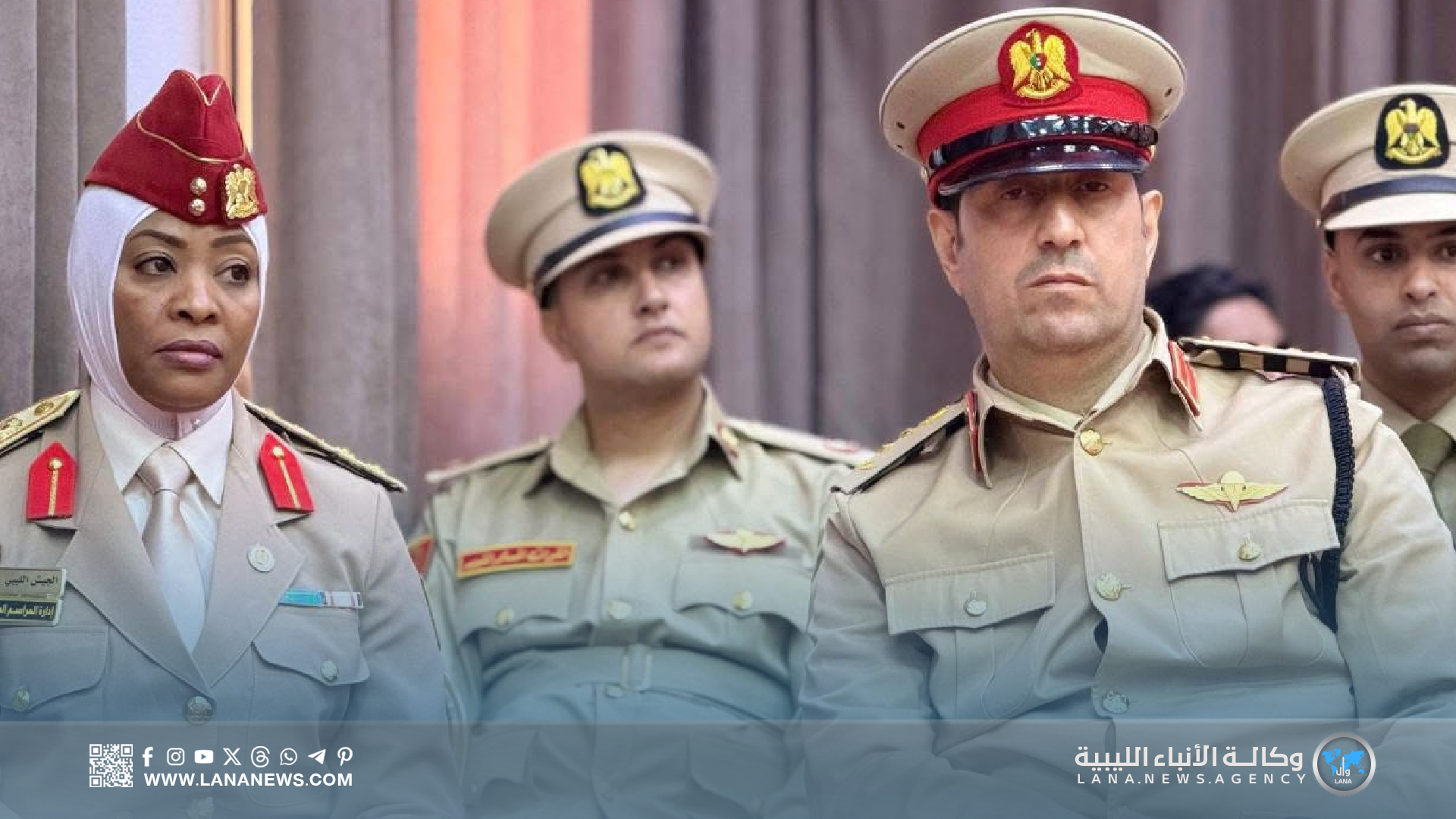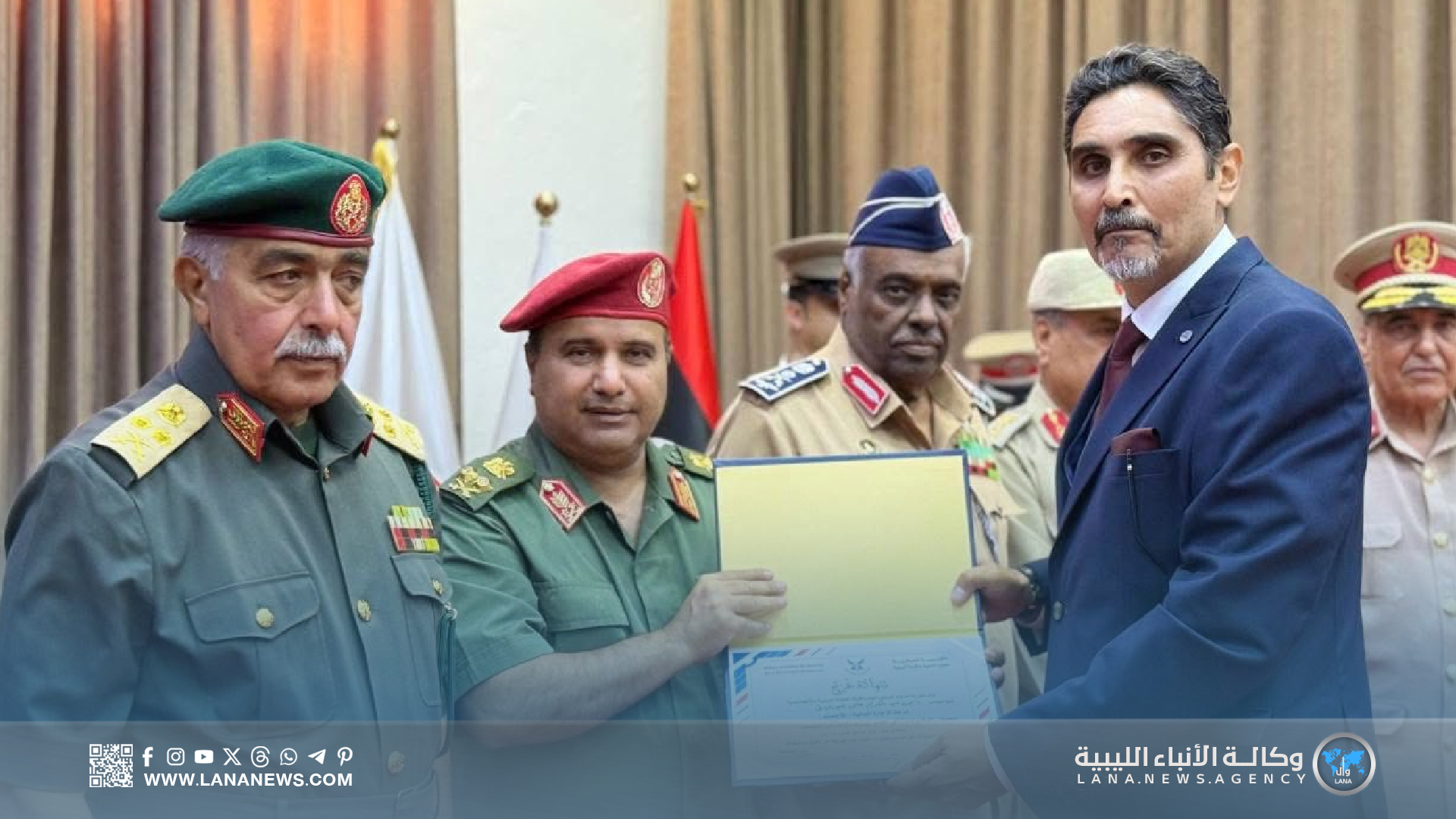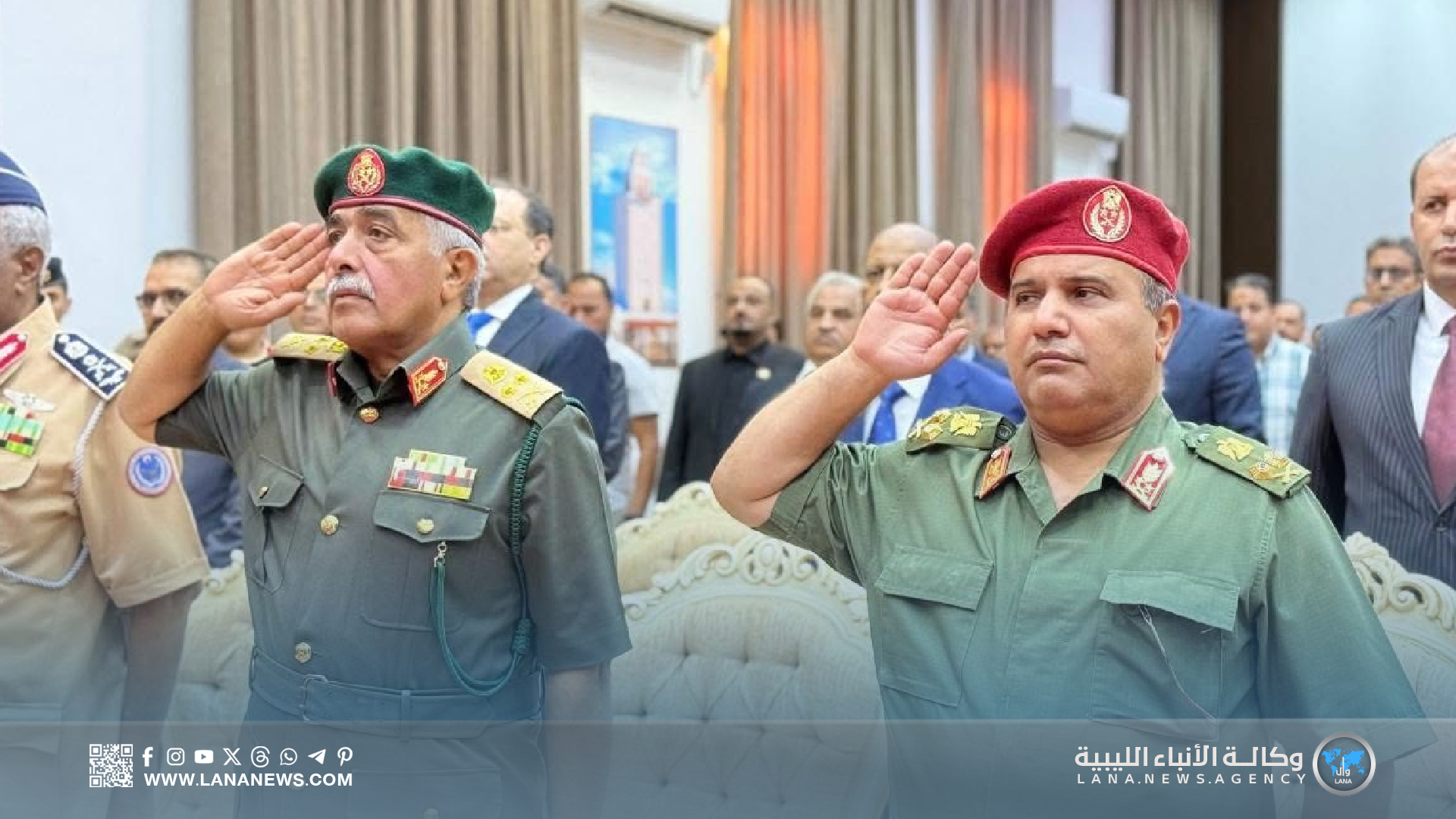 وحضر الحفل رئيس الأركان العامة الفريق أول عبدالرازق الناظوري، رفقة الأمين العام للقيادة العامة الفريق أول خيري التميمي، ورئيس أركان الوحدات الأمنية فريق ركن خالد حفتر، والفريق أيوب بوسيف، والمفتش العام فريق صقر الجروشي، ورئيس هيئة السيطرة اللواء “عون الفرجاني”، إلى جانب عدد من رؤساء الأركان النوعية، ورؤساء الهيئات، ومدراء الإدارات العسكرية.