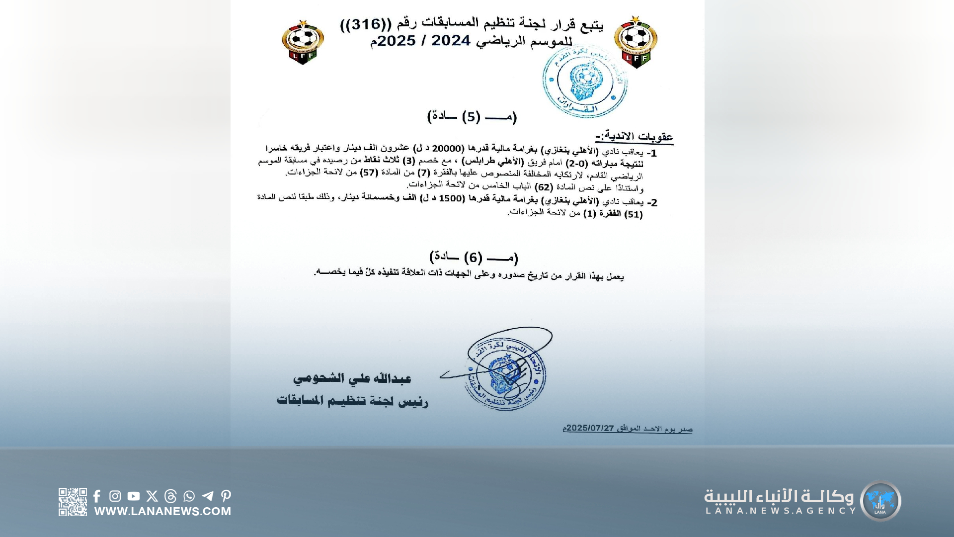 كما تم تغريم نادي الأهلي بنغازي 20.000 دينار ليبي، واعتباره خاسرًا بنتيجة 2-0 في مباراته أمام الأهلي طرابلس، مع خصم 3 نقاط من رصيده في الموسم القادم، بالإضافة إلى غرامة مالية أخرى بقيمة 1500 دينار ليبي، وفقًا للمواد المنصوص عليها في لائحة الجزاءات. (الأنباء الليبية – ميلانو) ر ت