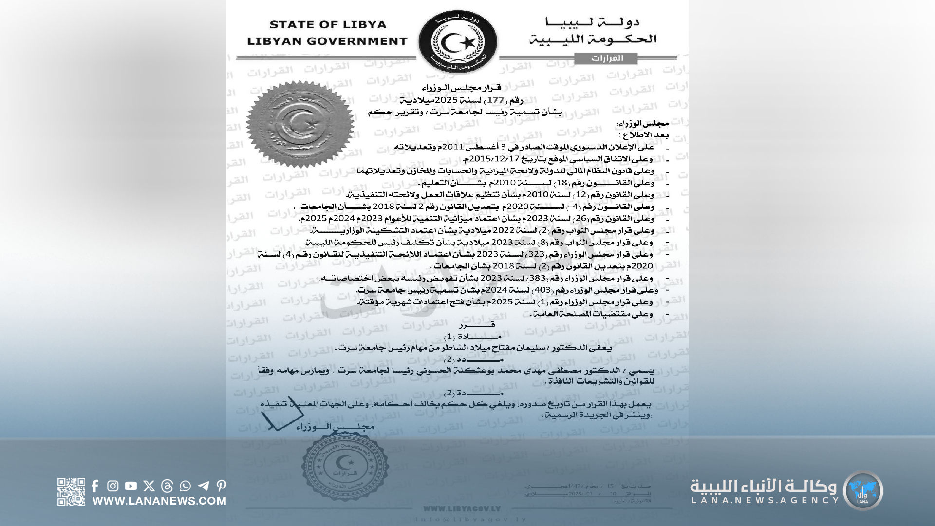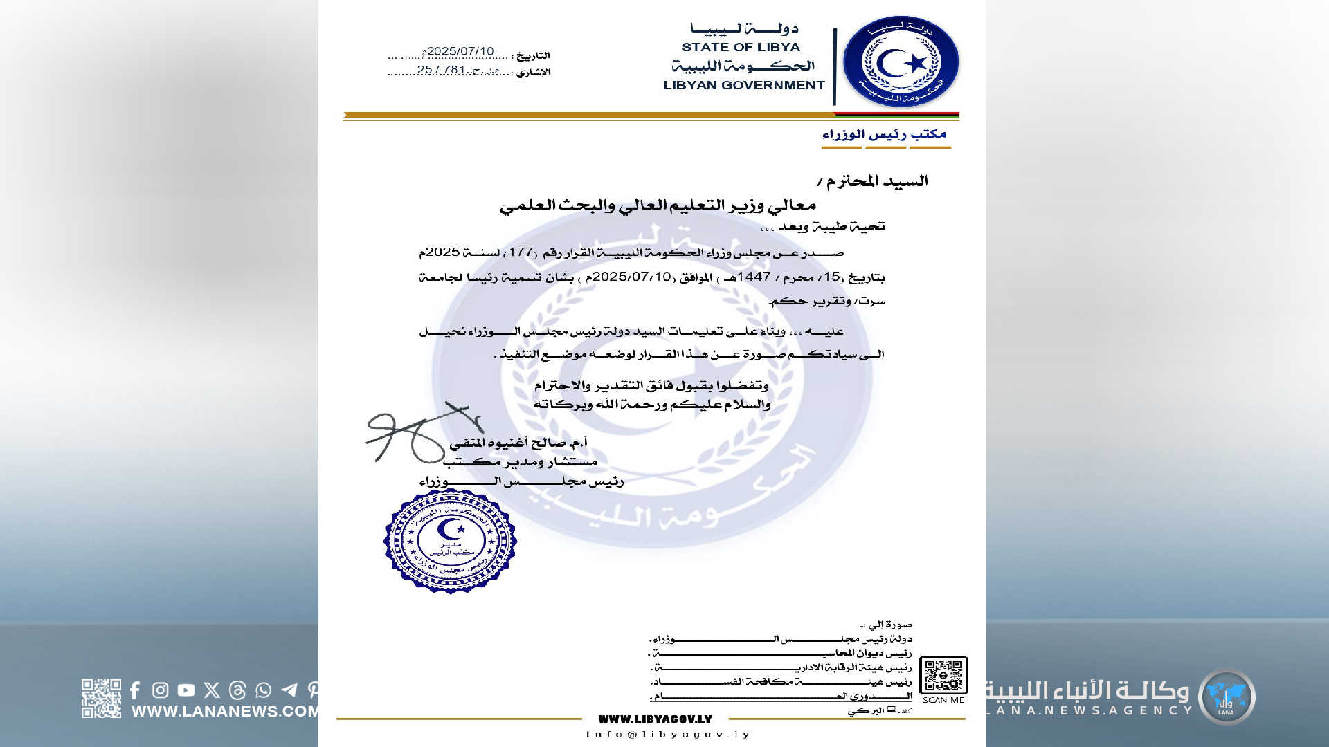 ويأتي هذا القرار في إطار الترتيبات الإدارية التي تجريها الحكومة الليبية، لتطوير الأداء الأكاديمي والإداري داخل مؤسسات التعليم العالي، وتعزيز دور الجامعات في دعم العملية التعليمية والبحثية على مستوى البلاد.
