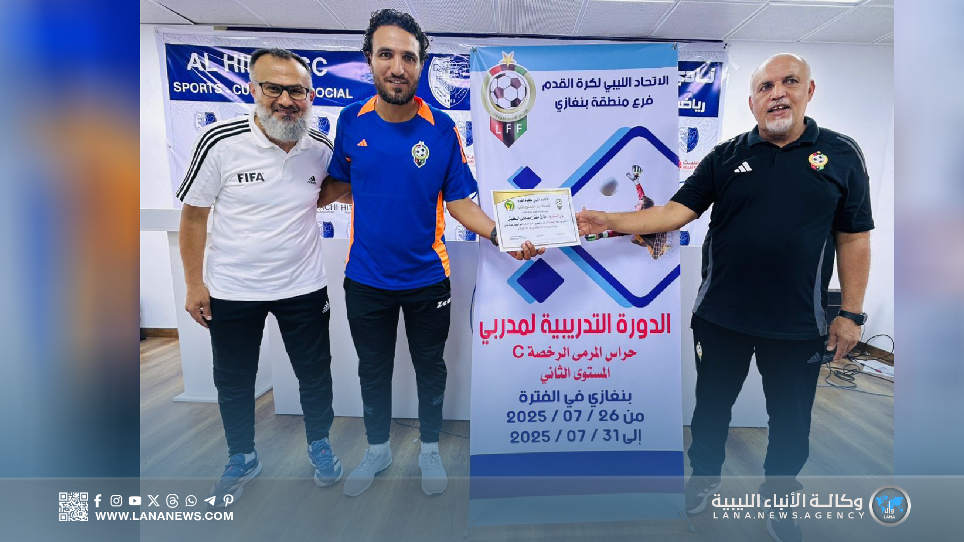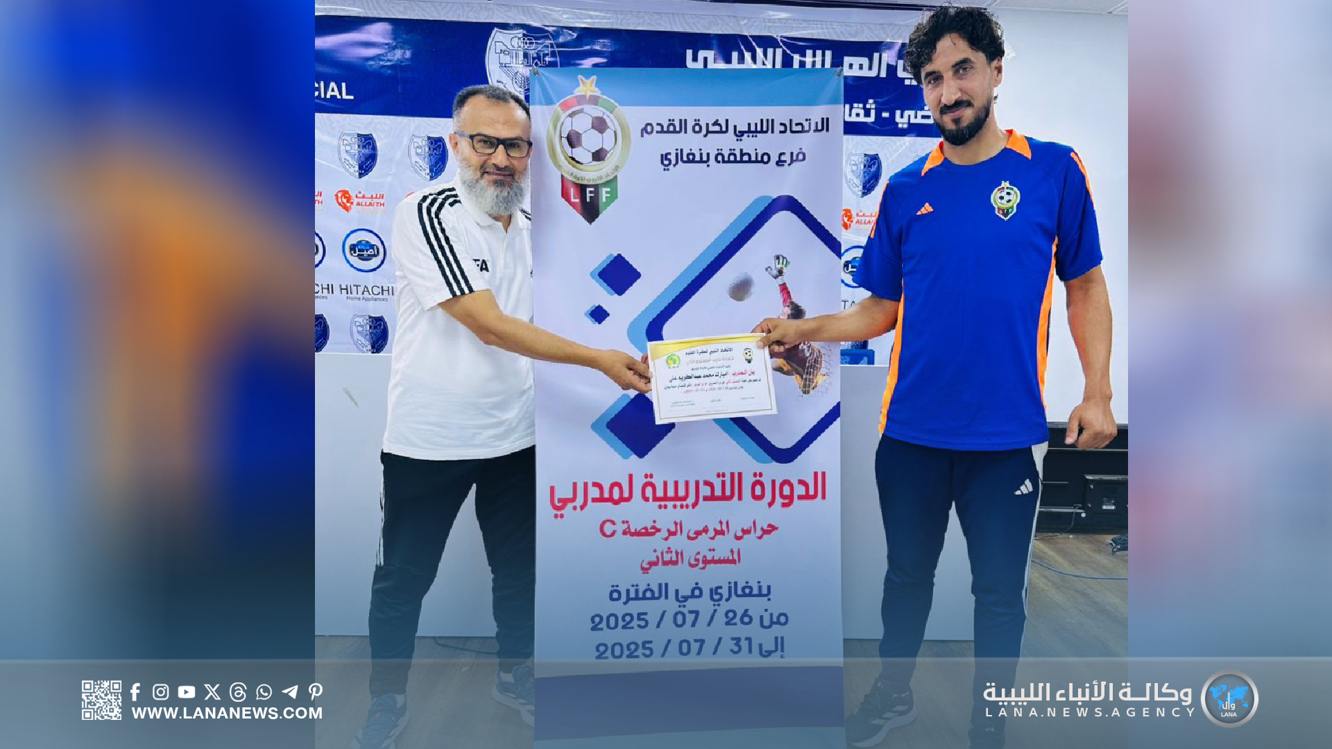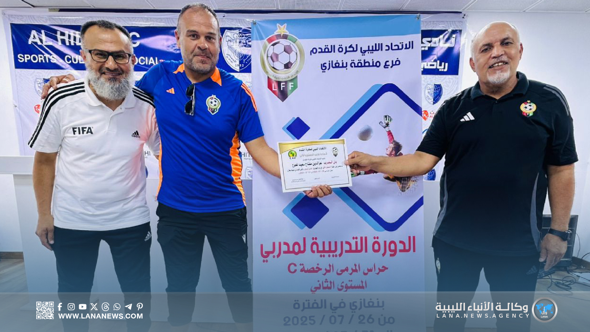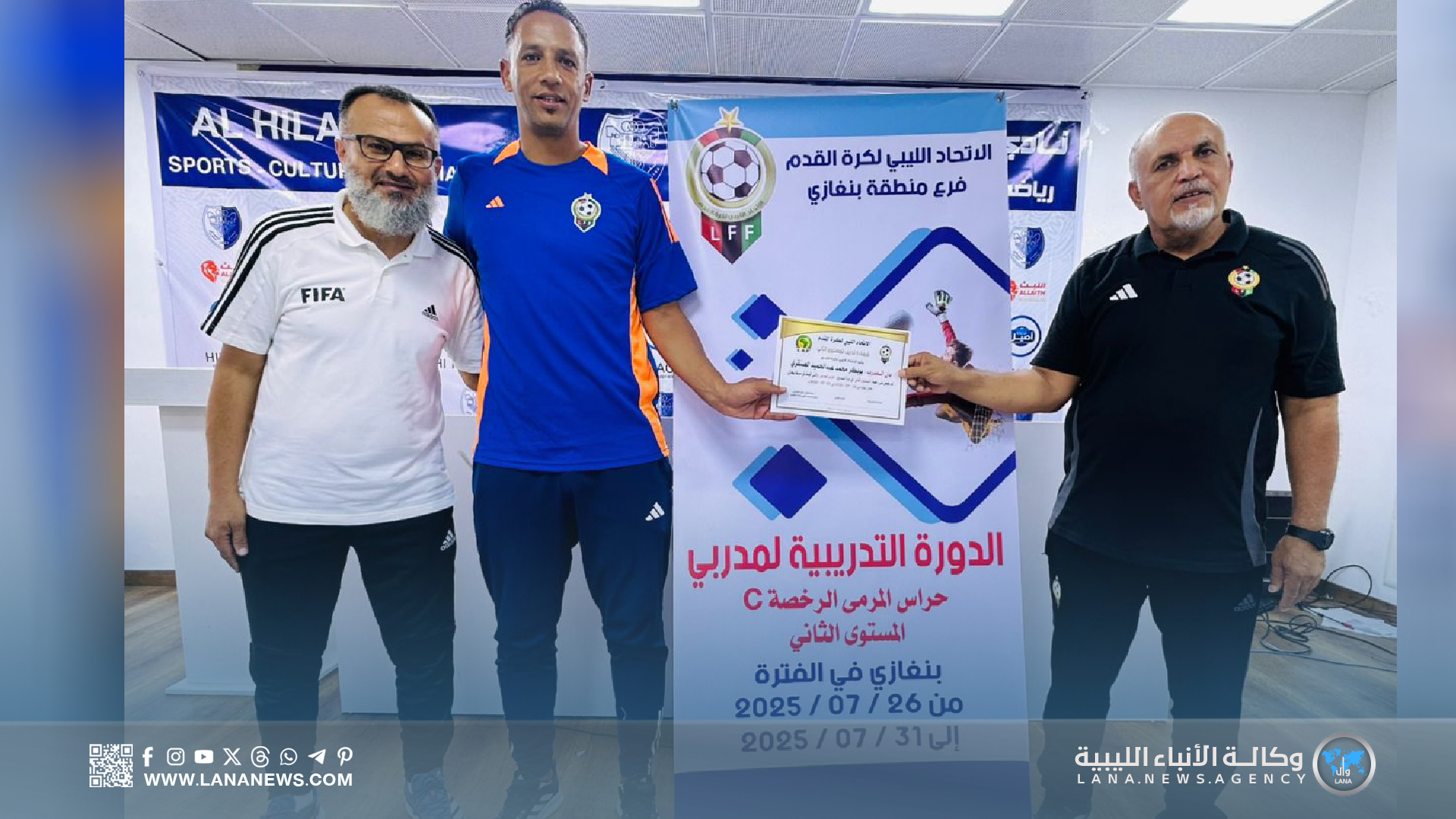 بنغازي 31 يوليو 2025 – ( الأنباء الليبية ) – اختتمت اليوم الخميس، بمدينة بنغازي، فعاليات دورة مدربي حراس المرمى لكرة القدم (المستوى الثاني)، التي نُظمت تحت إشراف الاتحاد الليبي لكرة القدم، وبإشراف مباشر من الاتحاد الفرعي بالمدينة، وذلك داخل مرافق نادي الهلال الرياضي.
