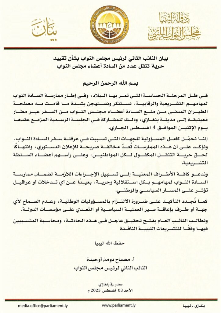 وأكد “دومة” في بيان رسمي أن هذا الإجراء يُعد انتهاكًا صريحًا للإعلان الدستوري وتعديًا على حق حرية التنقل المكفول لجميع المواطنين، مشيرًا إلى أن مثل هذه الممارسات تمثل عرقلة مباشرة لعمل السلطة التشريعية وتؤثر سلبًا على المسار السياسي الوطني.