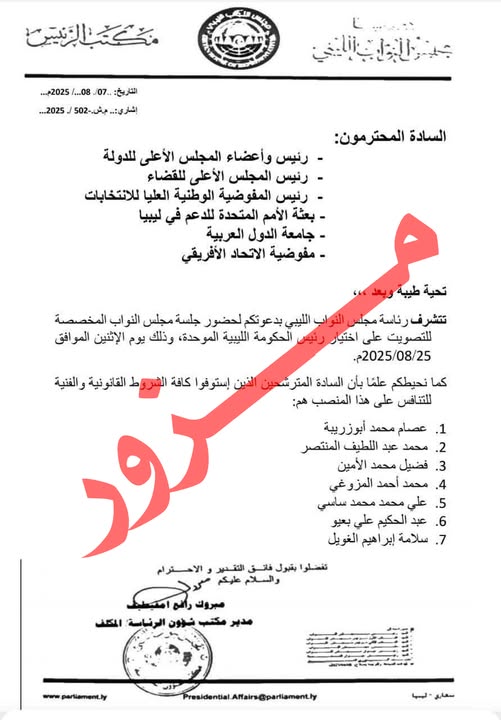 بنغازي 08 أغسطس 2025 (الأنباء الليبية) – نفى المتحدث باسم مجلس النواب الليبي، عبدالله بليحق، صحة مستند متداول على مواقع التواصل الاجتماعي يزعم دعوة المجلس لعدد من الجهات، بينها المجلس الأعلى للدولة، لحضور جلسة التصويت على اختيار رئيس جديد للحكومة في 25 أغسطس الجاري.