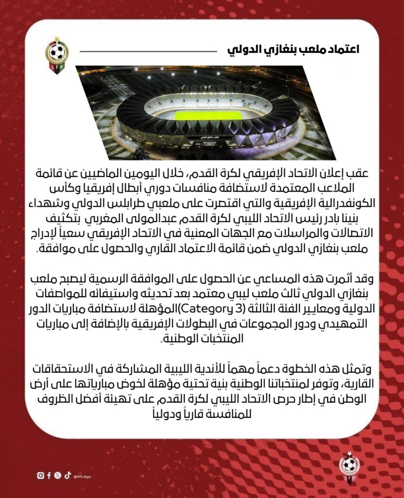 وأشار الاتحاد الليبي أن رئيس الاتحاد عبد المولى المغربي باشر بالتواصل مع الاتحاد الافريقي لكرة القدم سعياً لإدراج ملعب بنغازي الدولي ضمن قائمة الاعتماد القاري والتي لثمرت بالحصول على الموافقة الرسمية لضم ملعب بنغازي الدولي للملاعب المتعمدة افريقياً.