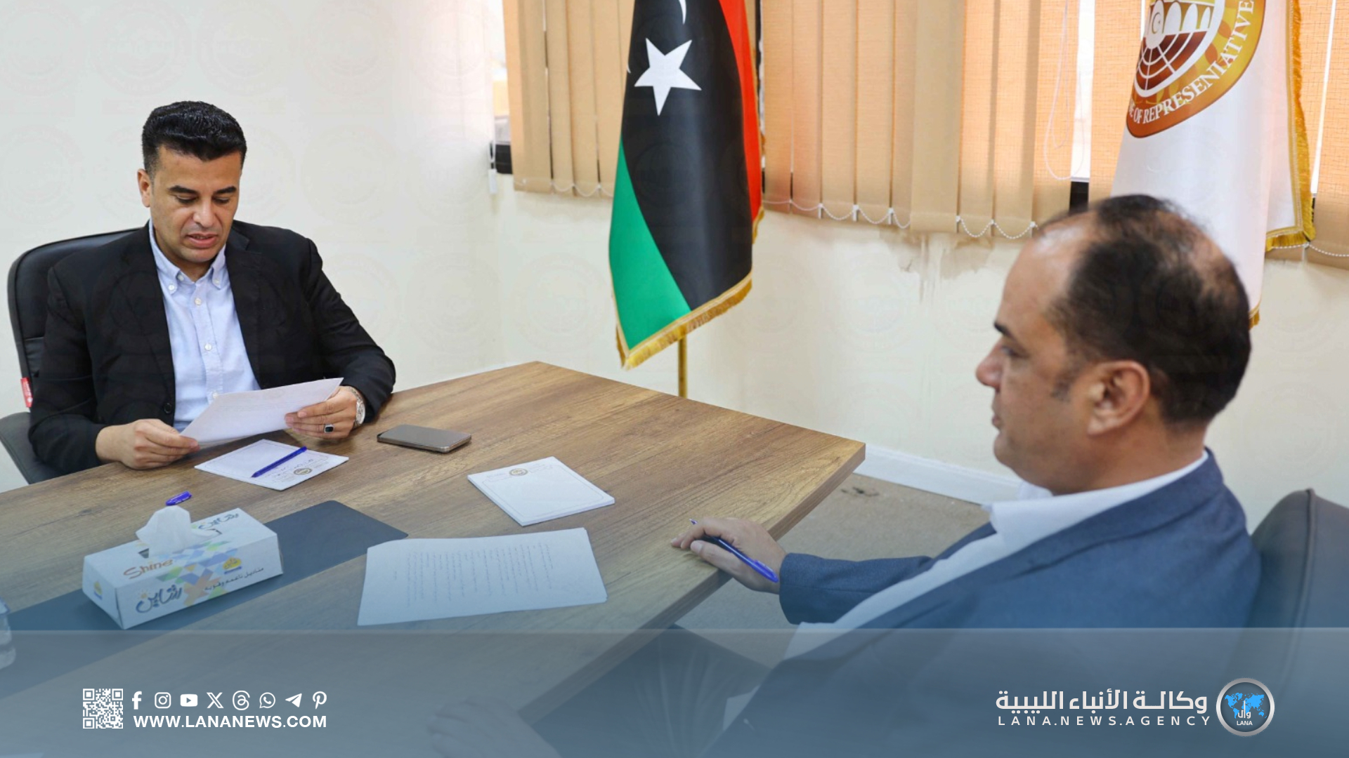 بنغازي 17 أغسطس 2025 (الأنباء الليبية)- عُقد اليوم الأحد بمقر ديوان مجلس النواب في مدينة بنغازي اجتماع ضم رئيس لجنة متابعة الأجهزة الرقابية بالمجلس زايد هدية، ورئيس لجنة الطاقة والموارد الطبيعية عيسى العريبي، كما شارك في الاجتماع عبر الاتصال المرئي رئيس لجنة التخطيط والمالية والموازنة العامة عمر تنتوش.