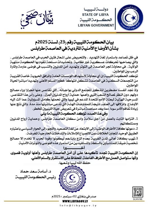 بنغازي 02 سبتمبر 2025 (الأنباء الليبية) – أكدت الحكومة الليبية أن الحفاظ على أمن العاصمة طرابلس وسلامة سكانها يأتي في مقدمة أولوياتها، مشددة على رفضها القاطع لأي محاولات تهدف إلى زعزعة الاستقرار أو نشر الفوضى عبر أعمال العنف أو التحريض.