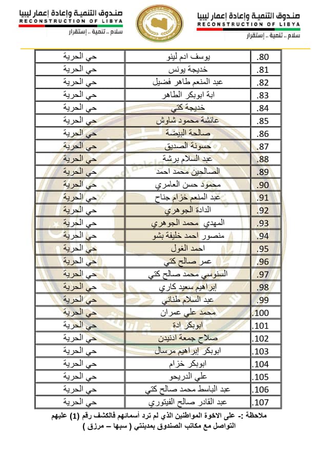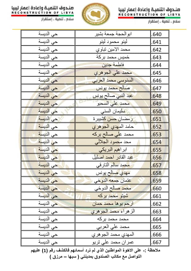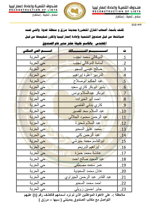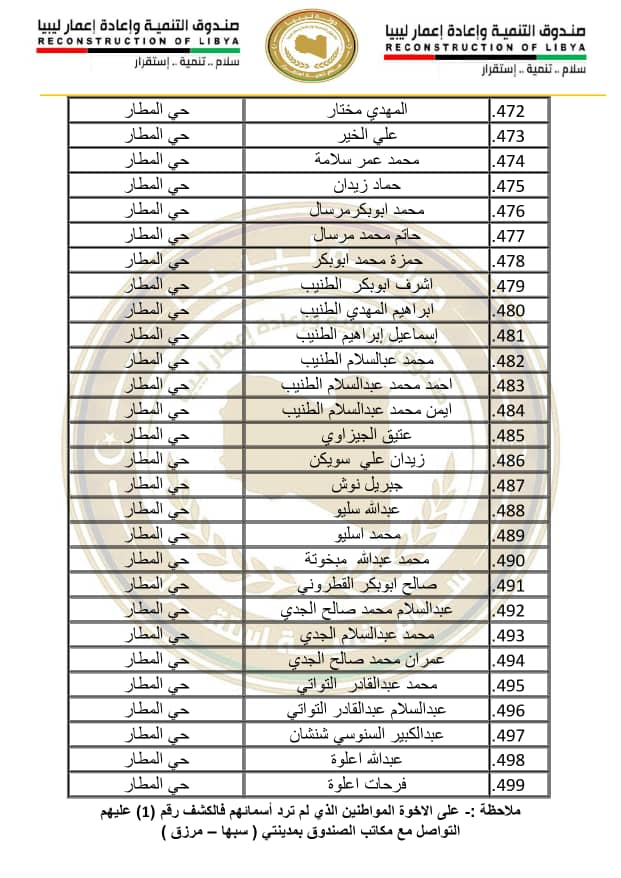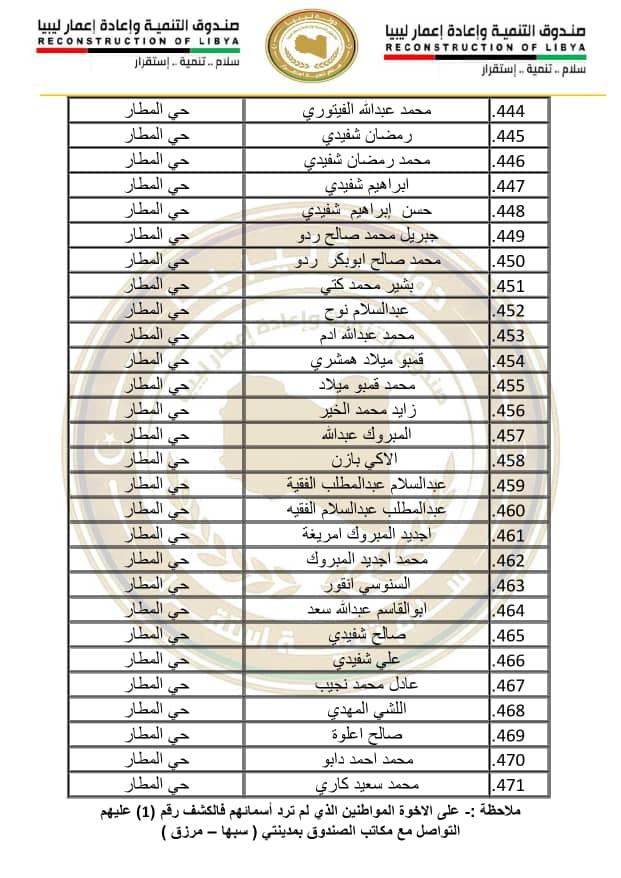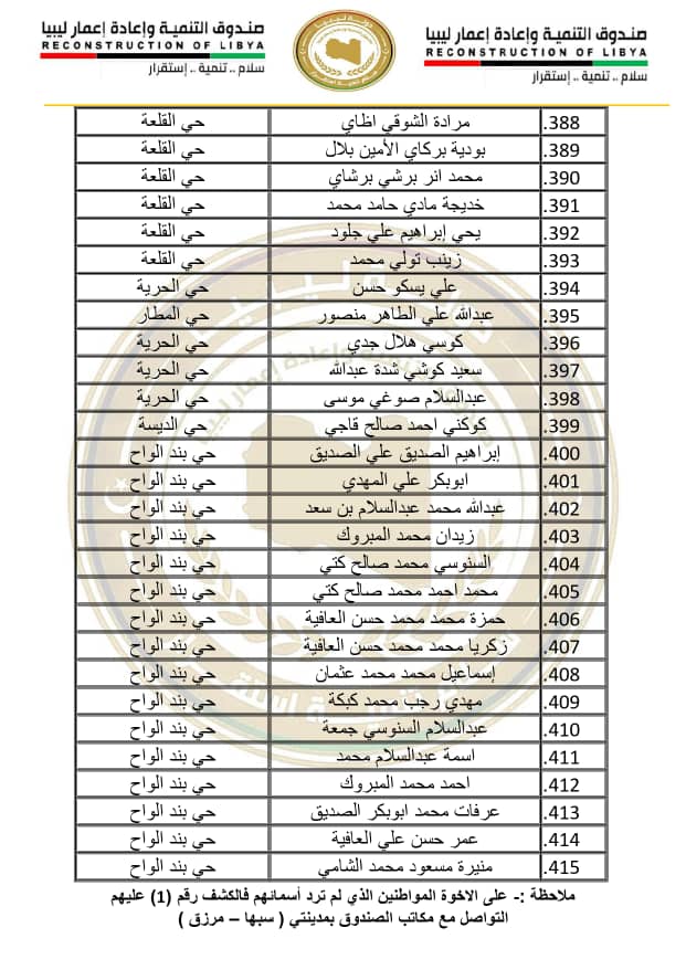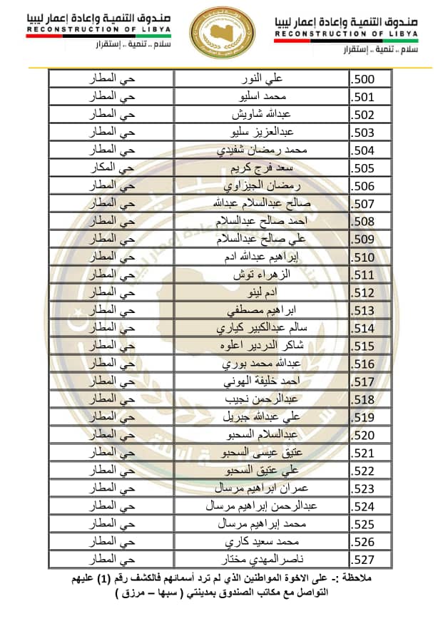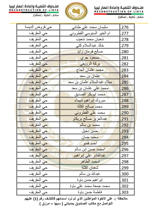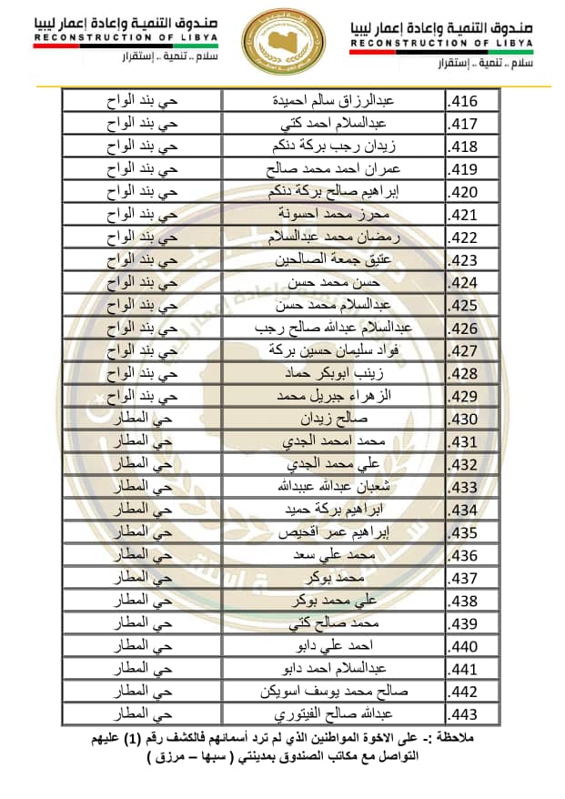 ودعا الصندوق المواطنين الذين لم ترد أسماؤهم في الكشف إلى ضرورة مراجعة مكاتب الصندوق في مدينتي سبها ومرزق لاستكمال الإجراءات اللازمة. (الأنباء الليبية – مرزق) ر ت