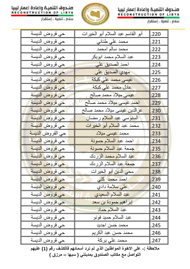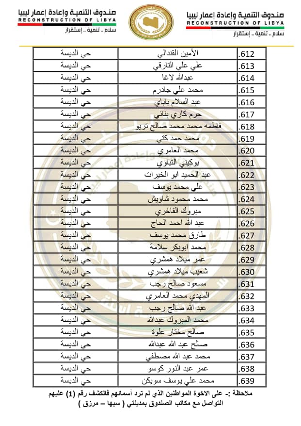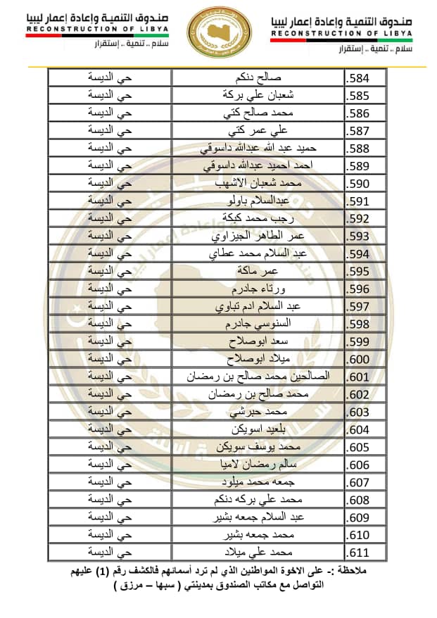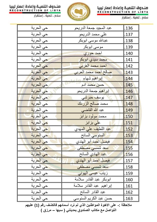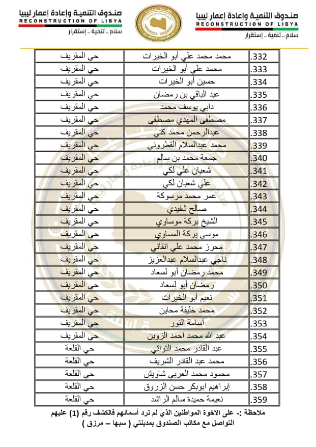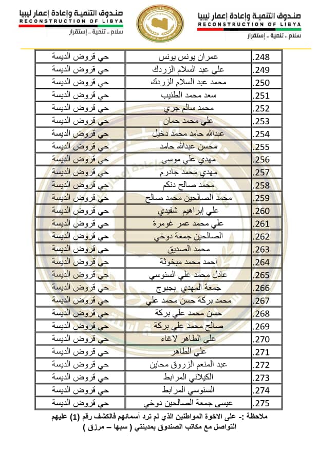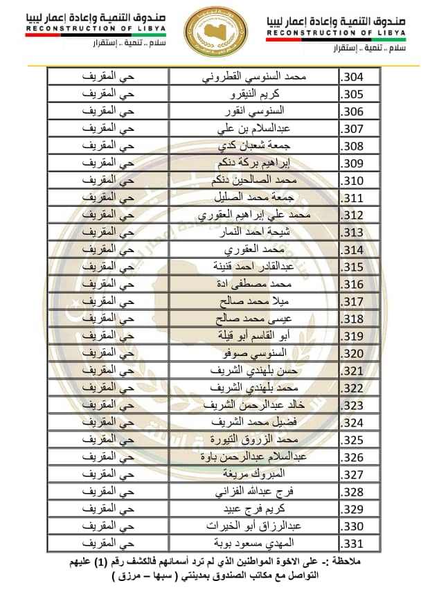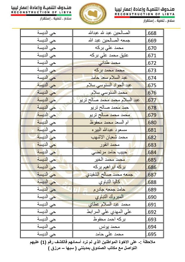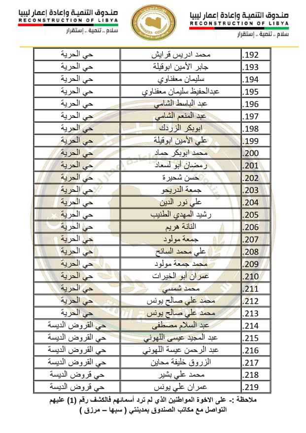ودعا الصندوق المواطنين الذين لم ترد أسماؤهم في الكشف إلى ضرورة مراجعة مكاتب الصندوق في مدينتي سبها ومرزق لاستكمال الإجراءات اللازمة. (الأنباء الليبية – مرزق) ر ت