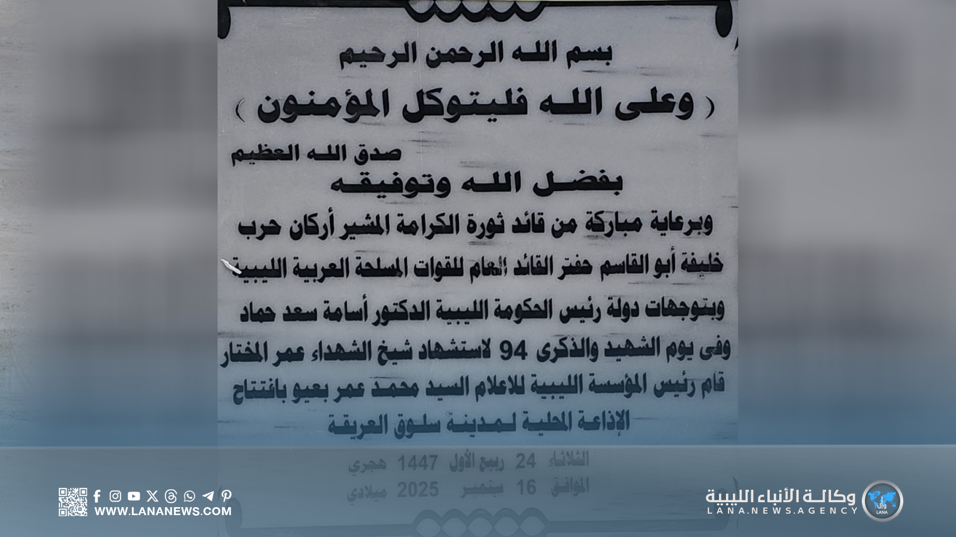 سلوق 16 سبتمبر 2025 (الأنباء الليبية) – أعلنت المؤسسة الليبية للإعلام، عن إطلاق إذاعة سلوق المحلية على تردد (106.9 FM)، تزامنا مع الاحتفال بيوم الشهيد الموافق 16 سبتمبر.
