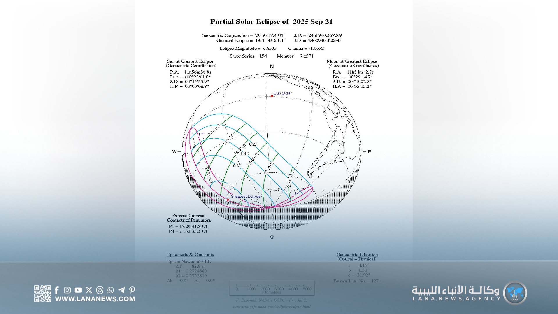 بنغازي 17 سبتمبر 2025 (الأنباء الليبية) – أعلن مكتب علوم الفلك والمراصد – بنغازي، بالمركز الليبي للاستشعار عن بعد وعلوم الفضاء، اليوم الأربعاء، أن العالم سيشهد في 21 سبتمبر، آخر كسوف جزئي، يُغطي خلاله قرص القمر ما يقارب 85 % من قرص الشمس عند ذروته.