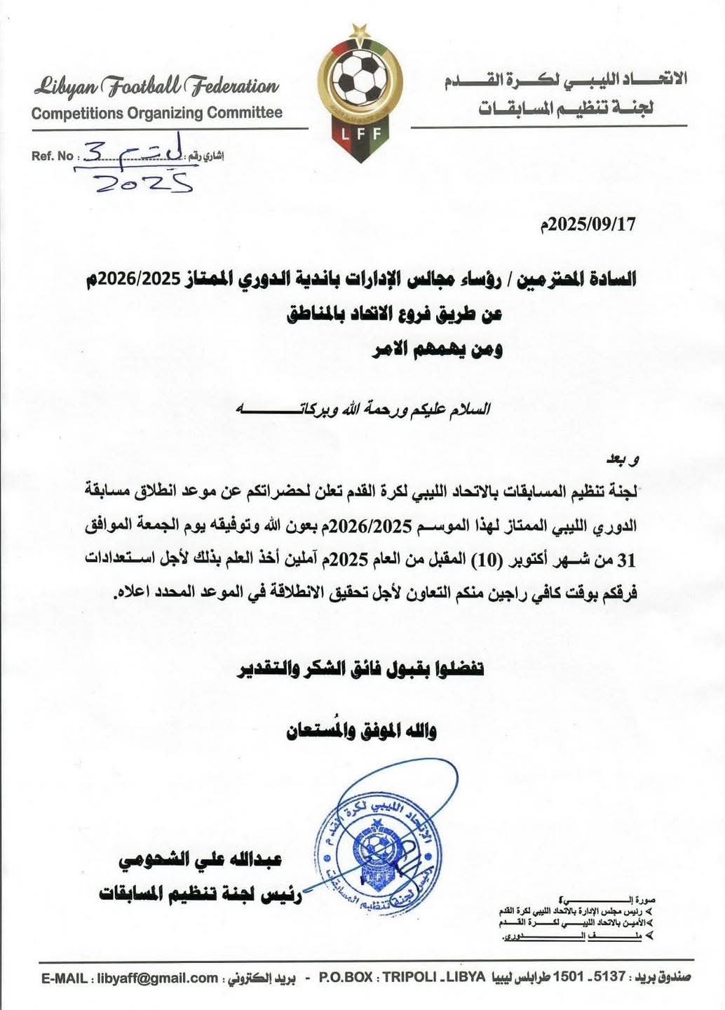 طرابلس 18 سبتمبر 2025 (الأنباء الليبية) – أعلنت لجنة تنظيم المسابقات بالاتحاد الليبي لكرة القدم، عن موعد انطلاق منافسات الدوري الليبي الممتاز لكرة القدم للموسم الرياضي 2025/2026.