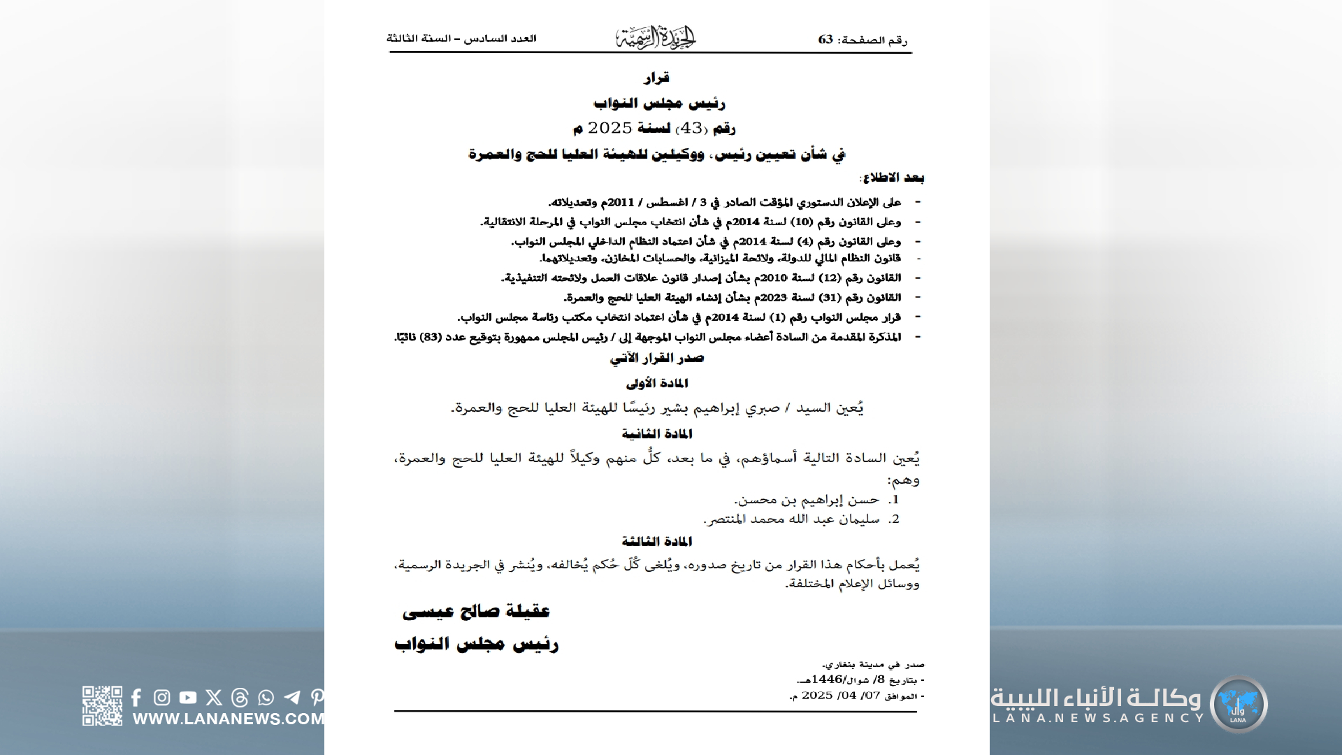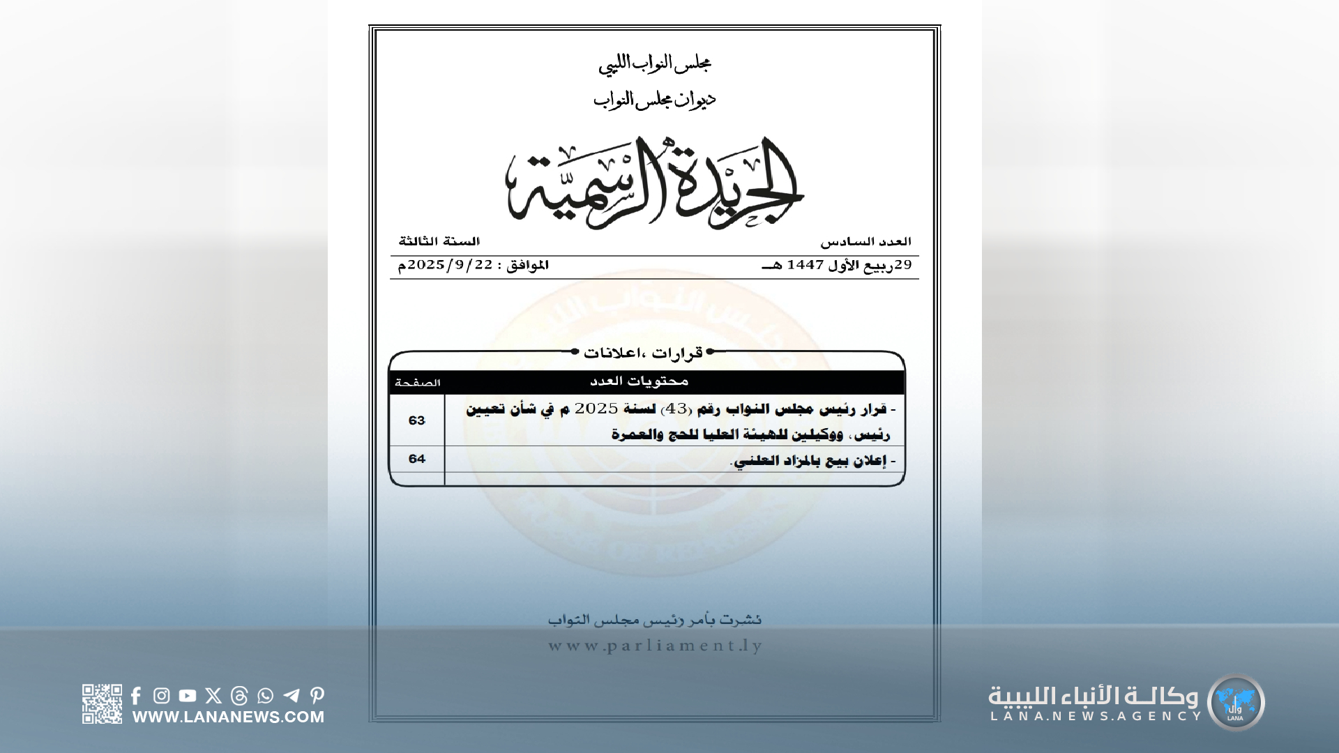 بنغازي 22 سبتمبر 2025 (الأنباء الليبية) – صدر اليوم الإثنين، العدد السادس من الجريدة الرسمية للسنة الثالثة عن ديوان مجلس النواب، مُتضمّنًا مجموعة من القرارات والتشريعات المهمة الصادرة عن مجلس النواب الليبي.