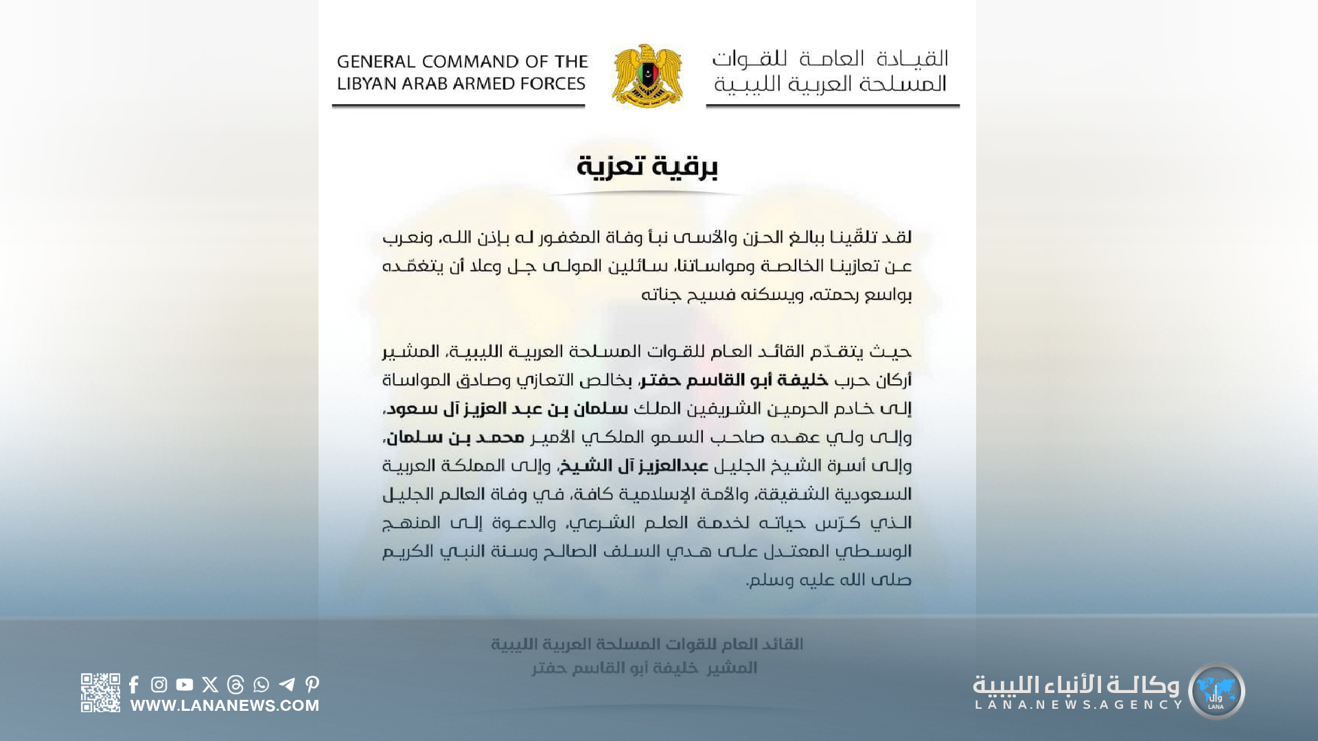 وختم البرقية، بالدعاء للفقيد بأن يتغمده الله برحمته الواسعة ويسكنه فسيح جناته، مُعربًا عن تضامنه مع المملكة العربية السعودية والأمة الإسلامية في هذا المصاب الأليم. (الأنباء الليبية – بنغازي) ر ت