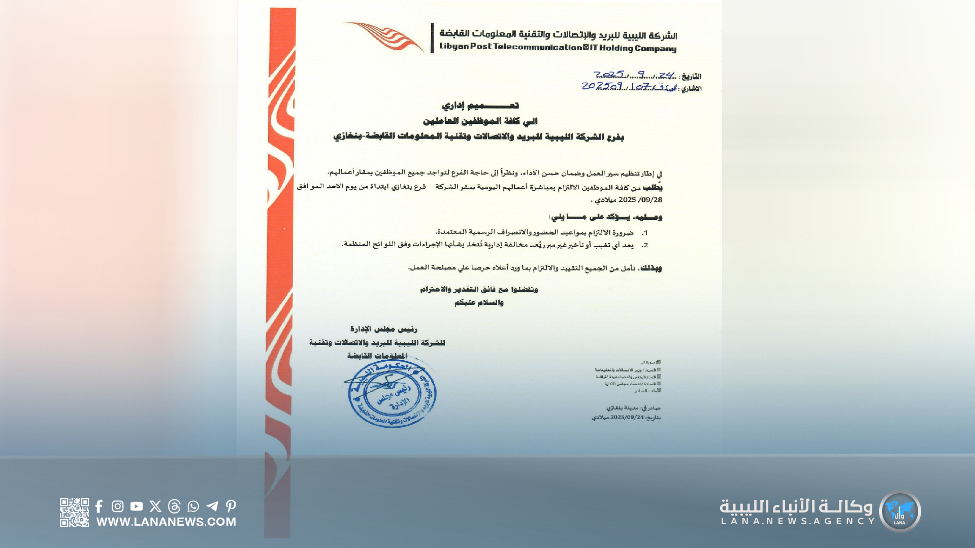 ودعت جميع العاملين إلى التقيد بما ورد في التعميم، حِرصًا على مصلحة العمل، وسير الأداء الإداري والفني على الوجه الأمثل، بما يُعزّز من مستوى الخدمات المقدمة للمواطنين والجهات المستفيدة. (الأنباء الليبية – بنغازي) ر ت