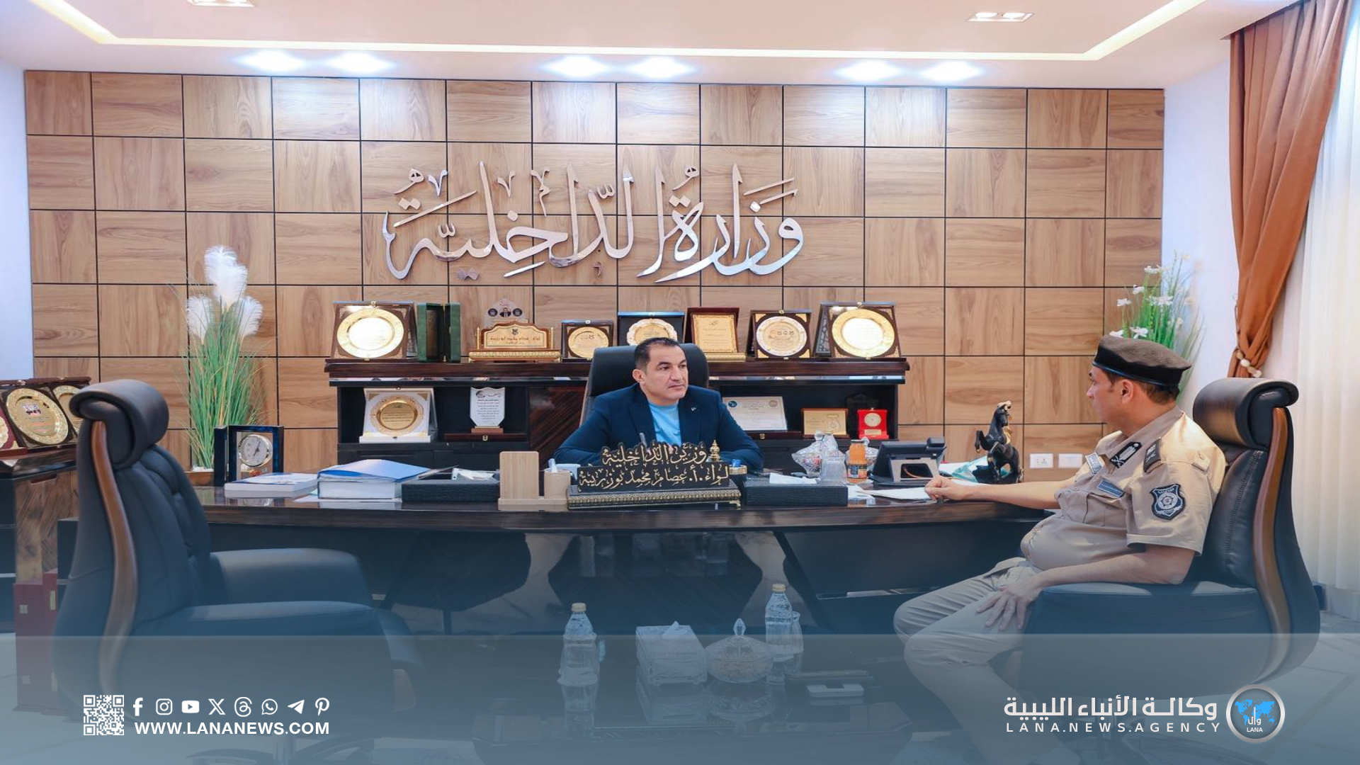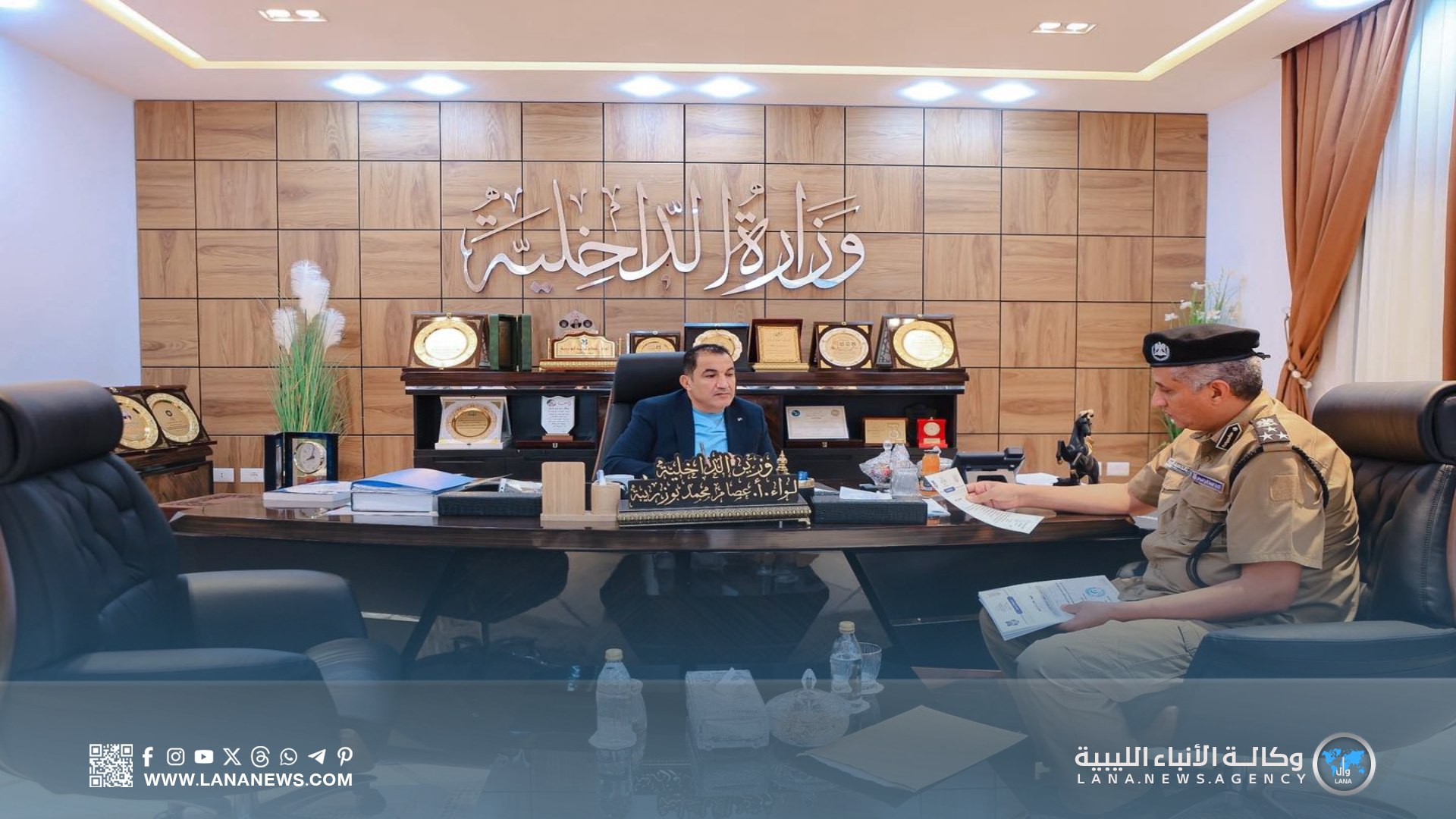 وفي الاجتماع الأخير، التقى الوزير مع مدير أمن الجبل الأخضر، اللواء منصور الجديد، ومعاونه اللواء عبدالباري محمد، لاستعراض الأوضاع الأمنية والإدارية بالمنطقة، إذ تم بحث جهود المديرية في تنفيذ الدوريات الميدانية، وخُطط افتتاح مقار أمنية جديدة، مع التأكيد على أهمية التنسيق لتعزيز الأمن وترسيخ الاستقرار.