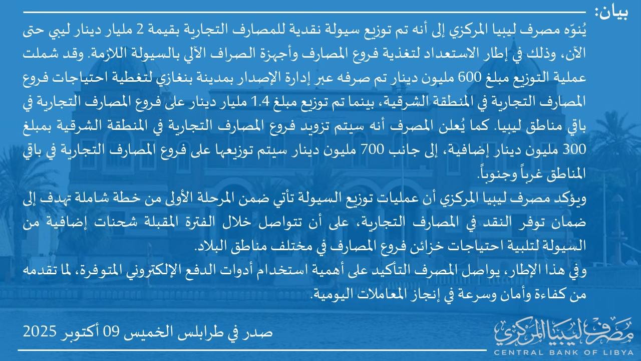 كما أشار البيان إلى أن المصرف يعتزم تزويد فروع المصارف التجارية في المنطقة الشرقية بمبلغ إضافي قدره 300 مليون دينار، إلى جانب توزيع 700 مليون دينار أخرى على الفروع المنتشرة في المناطق الغربية والجنوبية.