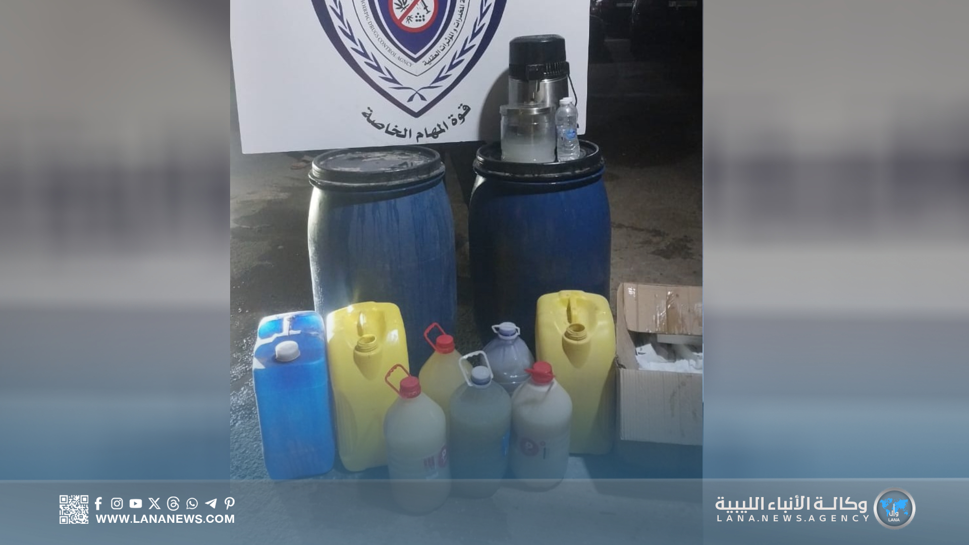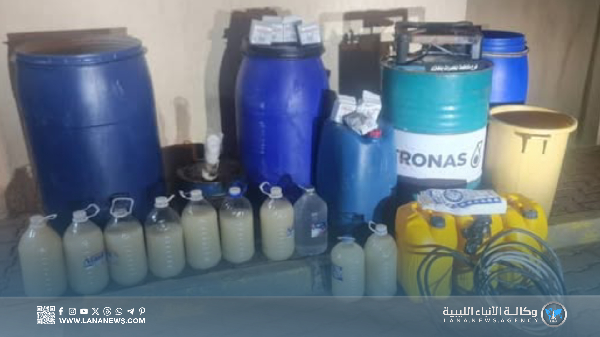 وفي سياق متصل، أعلنت مديرية أمن الجبل الأخضر مداهمة مصنع للخمور في منطقة مسة غرب مدينة البيضاء، حيث صادرت الأجهزة الأمنية أدوات إنتاج وغالونات معبأة وأسلحة بيضاء وسلاح خرطوش ومبلغا ماليا، وضبط شخصين داخل المصنع وإحالتهما إلى النيابة العامة.