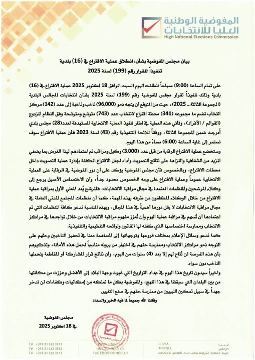 طرابلس 18 أكتوبر 2025 (الأنباء الليبية) – انطلقت اليوم السبت عملية الاقتراع في (16) بلدية ليبية من بين (28) بلدية مستهدفة في انتخابات المجموعة الثالثة للمجالس البلدية.