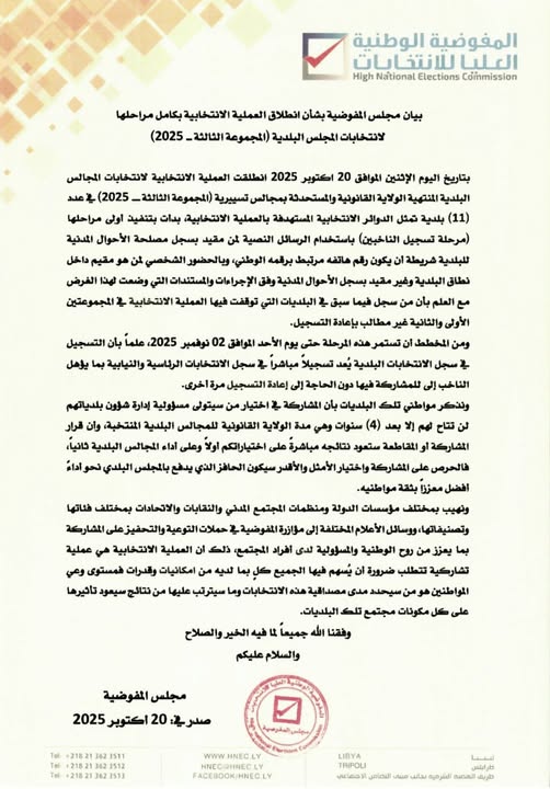 طرابلس 20 أكتوبر 2025 (الأنباء الليبية) – أعلن مجلس المفوضية الوطنية للانتخابات اليوم الإثنين انطلاق العملية الانتخابية في أحد عشر بلدية استكمالاً للمجموعة الثالثة لإنتخابات المجالس البلدية.