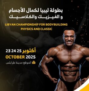 طرابلس 20 أكتوبر 2025 (الأنباء الليبية) – تنطلق أيام 23 و24 و25 أكتوبر الجاري منافسات بطولة ليبيا لبناء الأجسام والفيزيك والكلاسيك 2025، وذلك بقاعة 17 فبراير بالمدينة الرياضية في طرابلس، وسط مشاركة واسعة من رياضيي اللعبة من مختلف المدن الليبية.