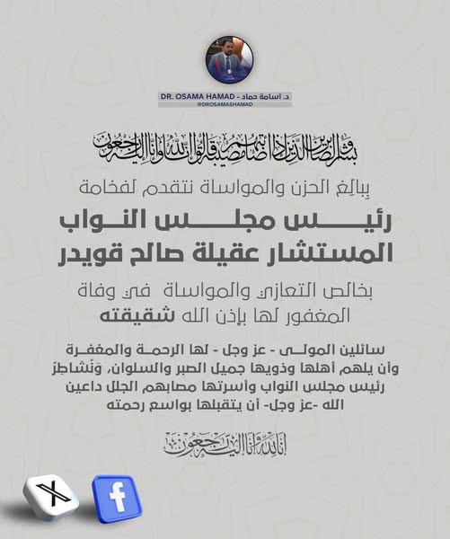 وأشار الدكتور حماد، في بيان نشره على صفحته الرسمية على فيس بوك، إلى أنه يشاطر رئيس مجلس النواب و أسرتها مصابهم الجلل. (الأنباء الليبية) ك و