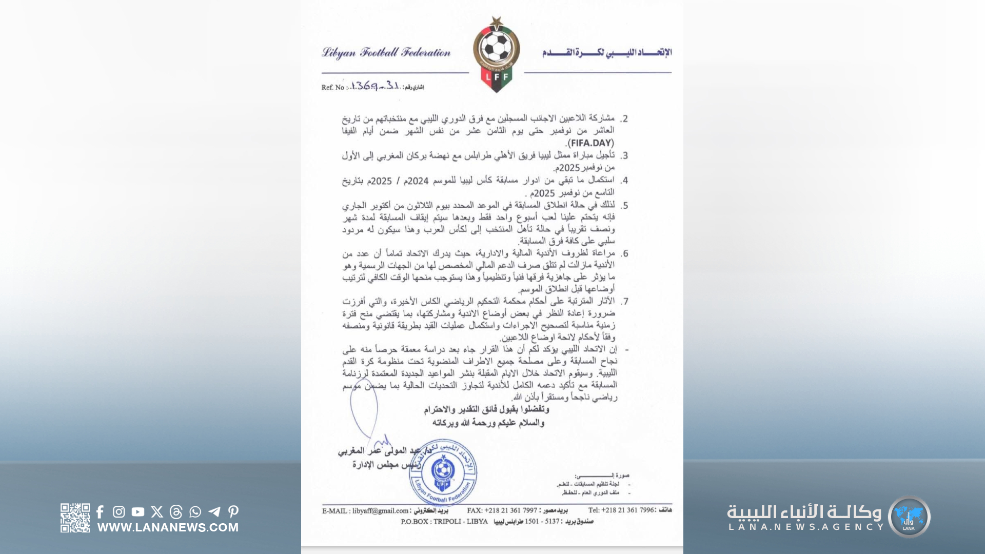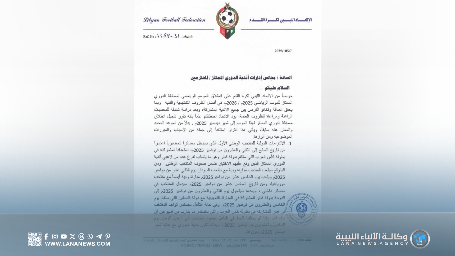 إذ جاء هذا القرار بناءً على عدة أسباب رئيسية، أبرزها: الالتزامات الدولية للمنتخب الوطني الأول، الذي سيدخل معسكرًا تحضيريًا في الفترة من 7 حتى 22 نوفمبر، استعدادًا للمشاركة في بطولة كأس العرب بقطر، بما في ذلك المباريات الودية ضد السودان وموريتانيا، بالإضافة إلى مشاركته في المباريات التمهيدية للبطولة، ومشاركة اللاعبين الأجانب المسجلين مع فرق الدوري الليبي مع منتخباتهم خلال أيام الفيفا من 10 وحتى 18 نوفمبر.