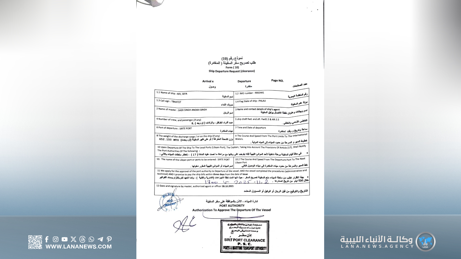 وقال عضو لجنة الإدارة بالمنطقة الحرة سرت ومدير عام ميناء سرت البحري التجاري، مهندس إبراهيم أدره، لمراسل “وال” بسرت، إن السفينة التجارية “سيفا” قد غادرت الميناء عشية اليوم بعد تفريغ حمولتها بالكامل، مُضيفًا أن هذه الشحنة تُمثل خطوةً مهمة في تنفيذ مشروعات التنمية الرياضية ضمن رؤية ليبيا 2030.