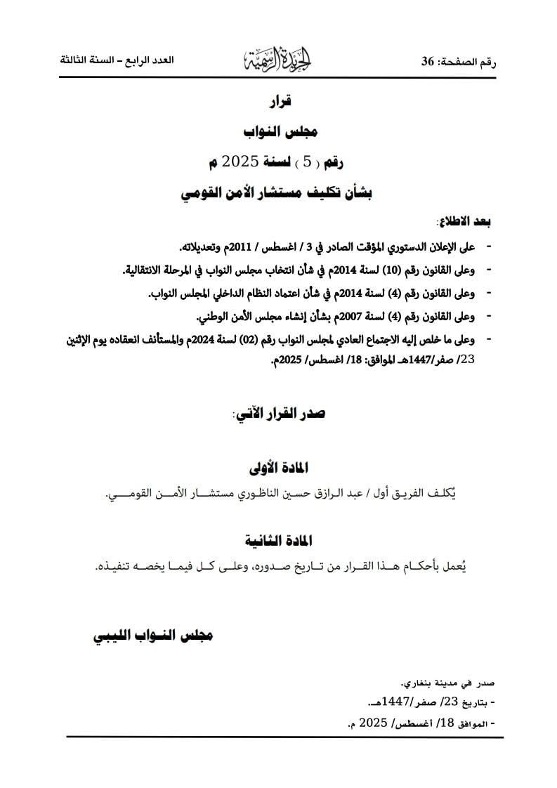 يشار إلى أن مجلس الأمن القومي المشكل بموجب القانون رقم (4) لسنة 2007 ميلادي، يتبع بموجب قانون إنشائه إلى السلطة التشريعية الموكل إليها تعيين مستشار الأمن القومي. (الأنباء الليبية)