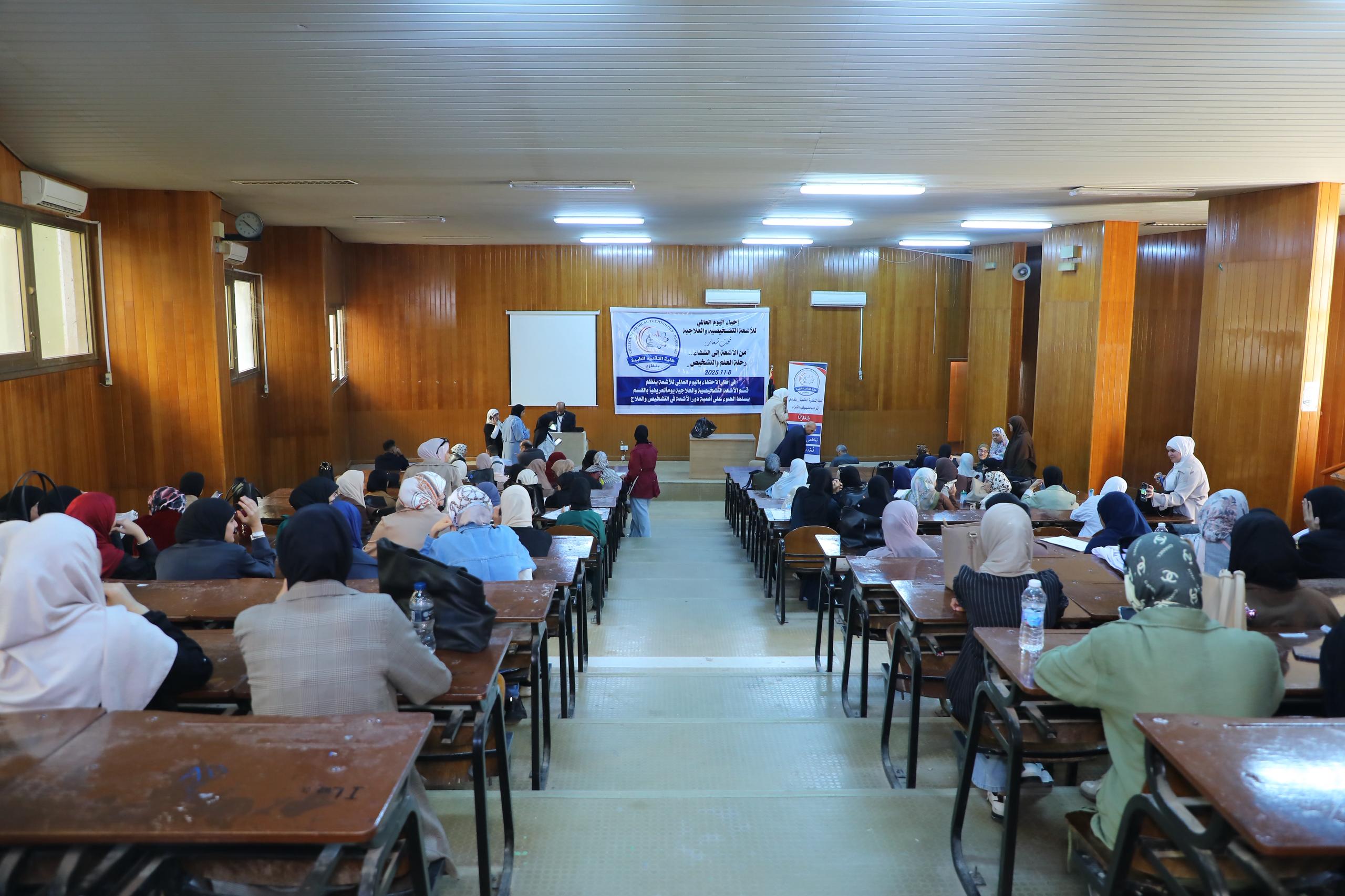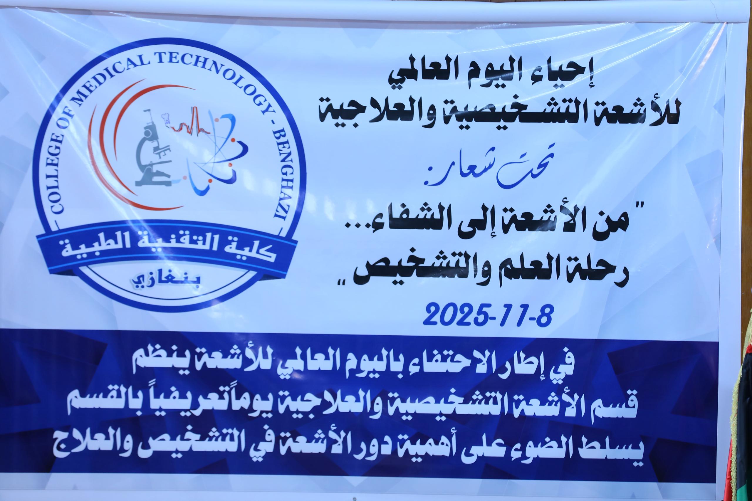 بنغازي 08 نوفمبر 2025 (الأنباء الليبية) ـ احتفت كلية التقنية الطبية بنغازي صباح اليوم باليوم العالمي للأشعة التشخيصية والعلاجية، تحت شعار “من الأشعة إلى الشفاء .. رحلة العلم والتشخيص”، بحضور أعضاء هيئة التدريس والطلبة والباحثين، وعدد من ممثلي النقابات المختصة.