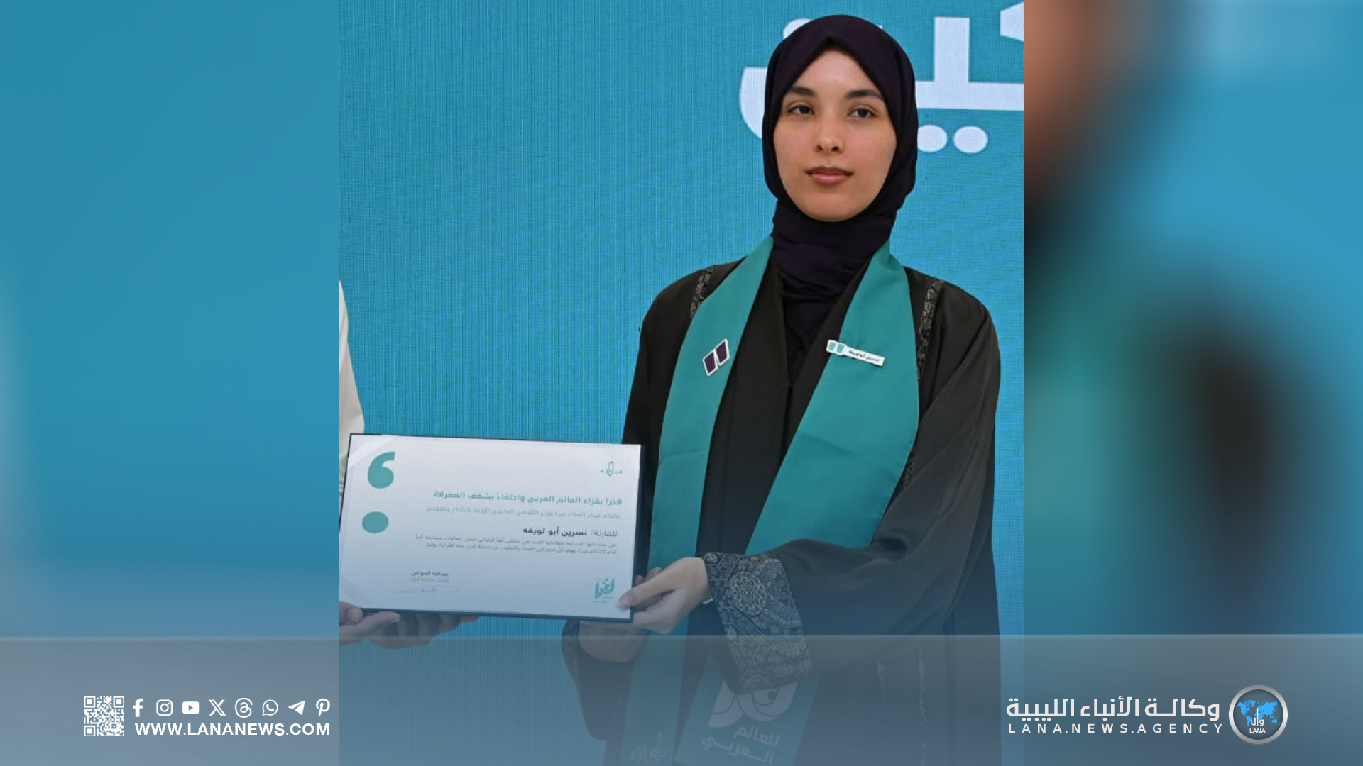 مصراتة 08 نوفمبر 2025 (الأنباء الليبية) – أعربت الطالبة الليبية، نسرين علي أبولويفة، إحدى القراء الستة المتأهلين لنهائيات مسابقة (أقرأ) للعالم العربي 2025 عن سعادتها بتمثيل ليبيا لأول مرة في النسخة العاشرة لهذه المسابقة المرموقة، وشكرت والدتها على كل ما يسرته لها داخل البيت لتستمر وتستثمر في نفسها ثقافيا، ووالدها الذي رافقها في رحلتها للمسابقة داخل السعودية.