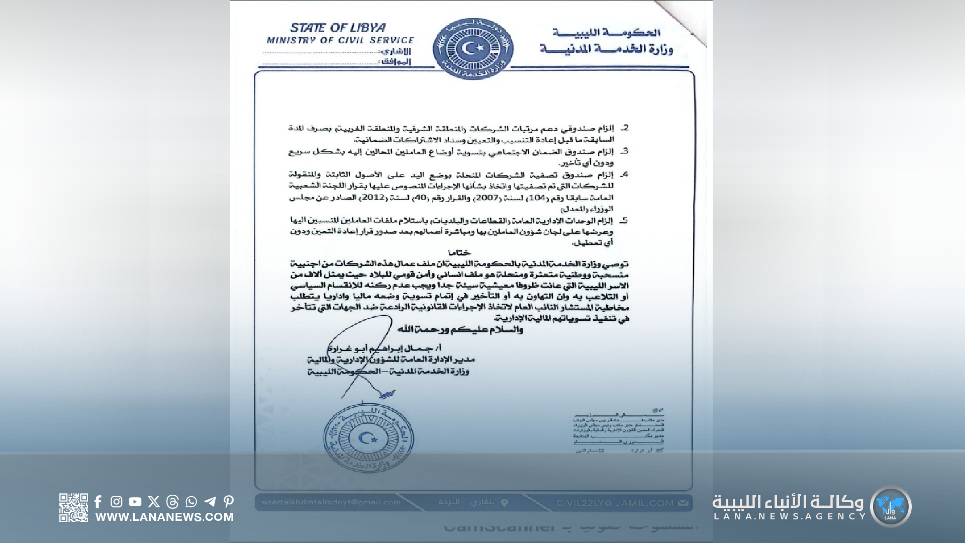 وأوضح مدير الإدارة العامة للشؤون الإدارية والمالية بالوزارة، جمال بوغرارة، في تصريح لوكالة الأنباء الليبية، أن التقرير يأتي ضِمن متابعة الوزارة لملف الشركات التي توقّف نشاطها داخل ليبيا، سواء بسبب انسحابها أو تعثّر أعمالها، وما ترتب على ذلك من أوضاع وظيفية للعمالة الوطنية المرتبطة بها.
